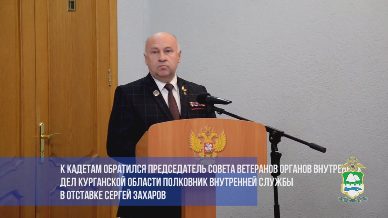 Председатель Совета ветеранов органов внутренних дел Курганской области полковник внутренней службы в отставке Сергей Захаров вручил ученикам брошюры, в которых отражена история кадетского движения России. Кроме того, каждый кадет, принявший присягу, получил экземпляр Конституции Российской Федерации.