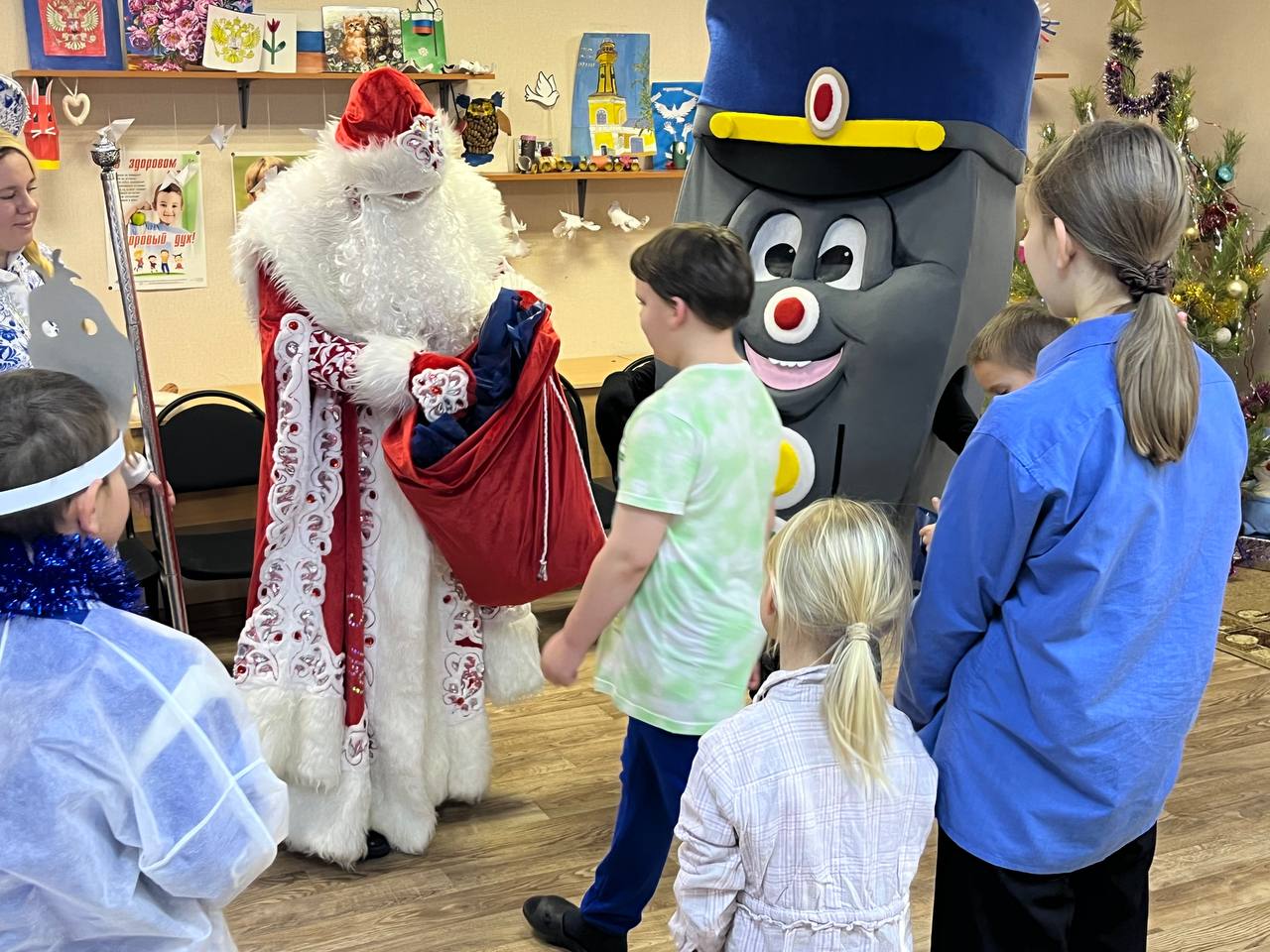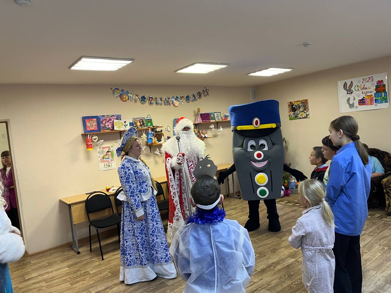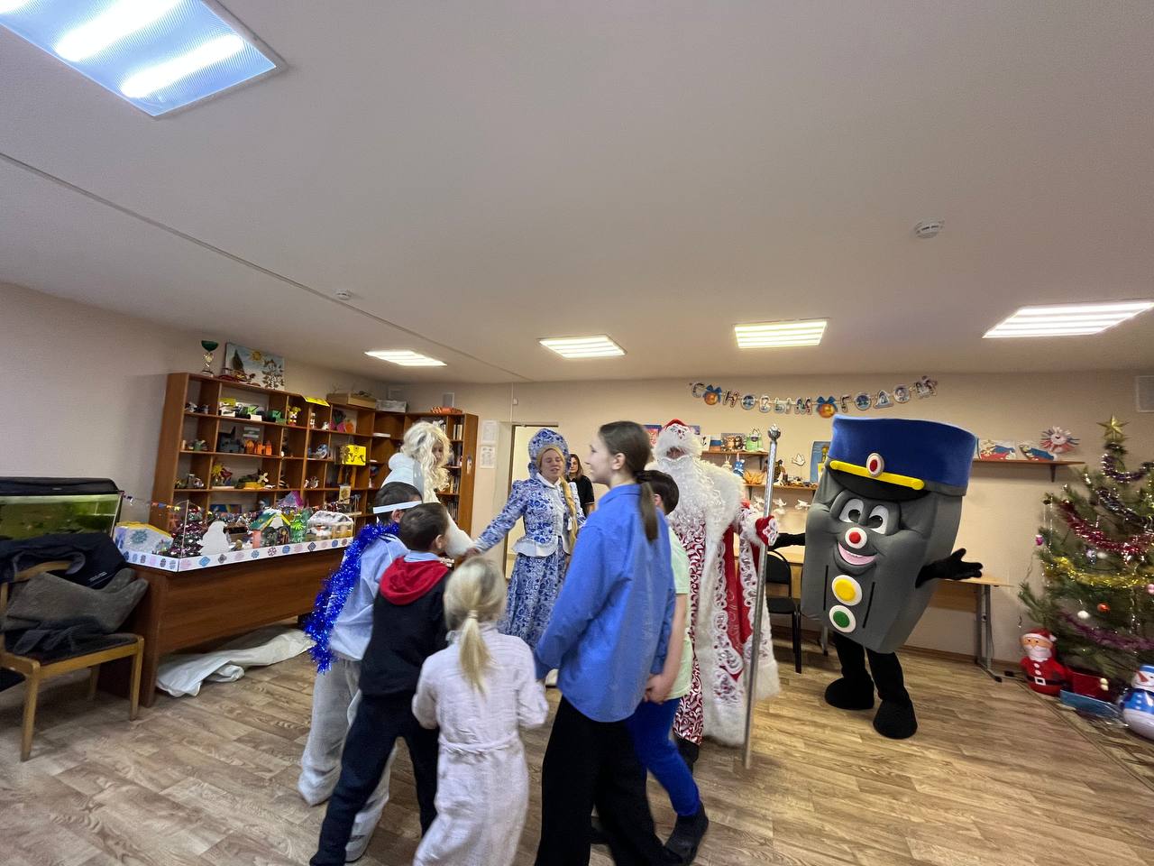 Для ребят была организована развекательно- познавательная программа, которая максимально подняла им настроение, главные герои праздники подарили подарки, а ростовая кукла в виде светофоранапомнила о важности соблюдения Правил дорожного движения в период предстоящих каникул.