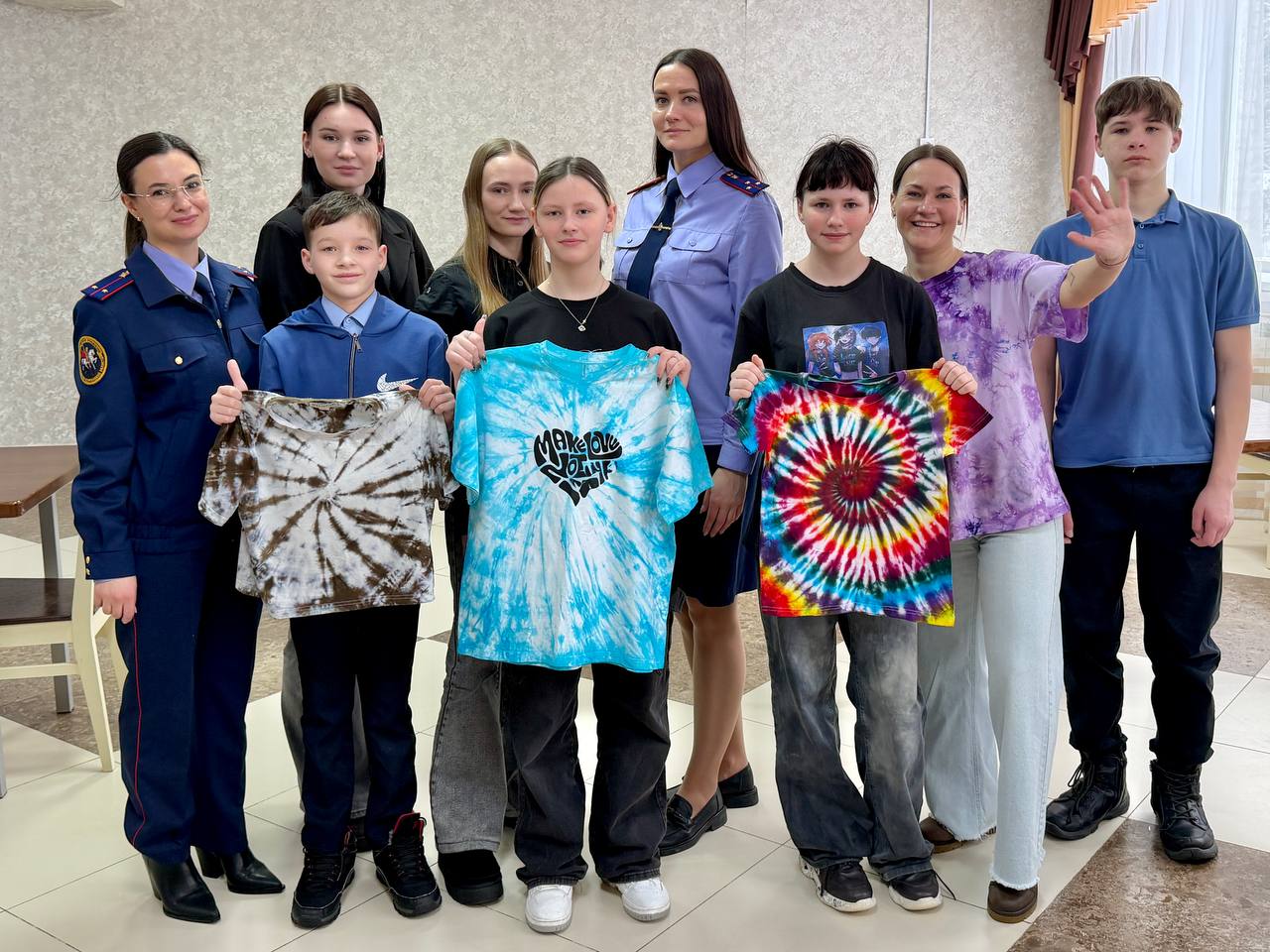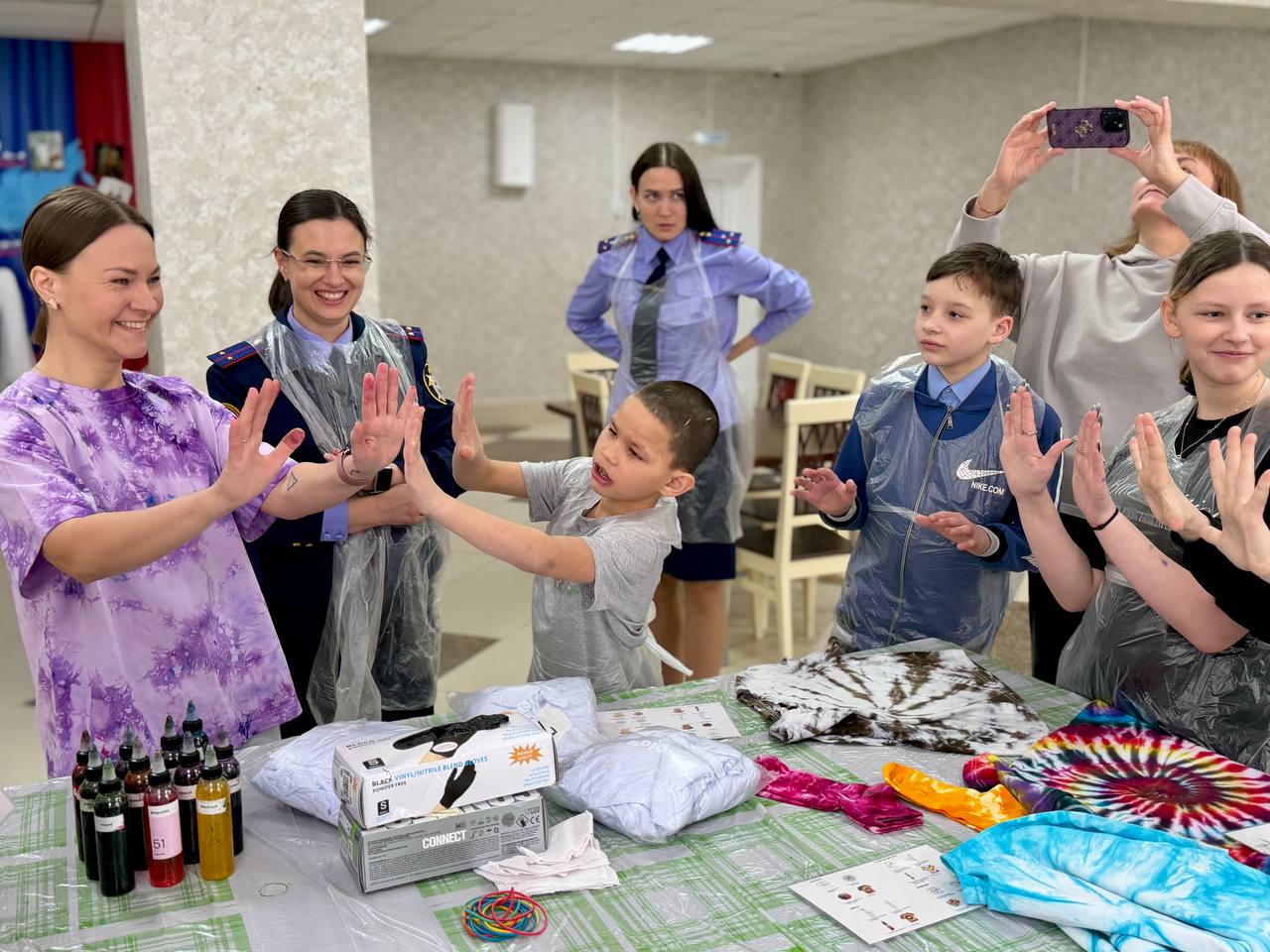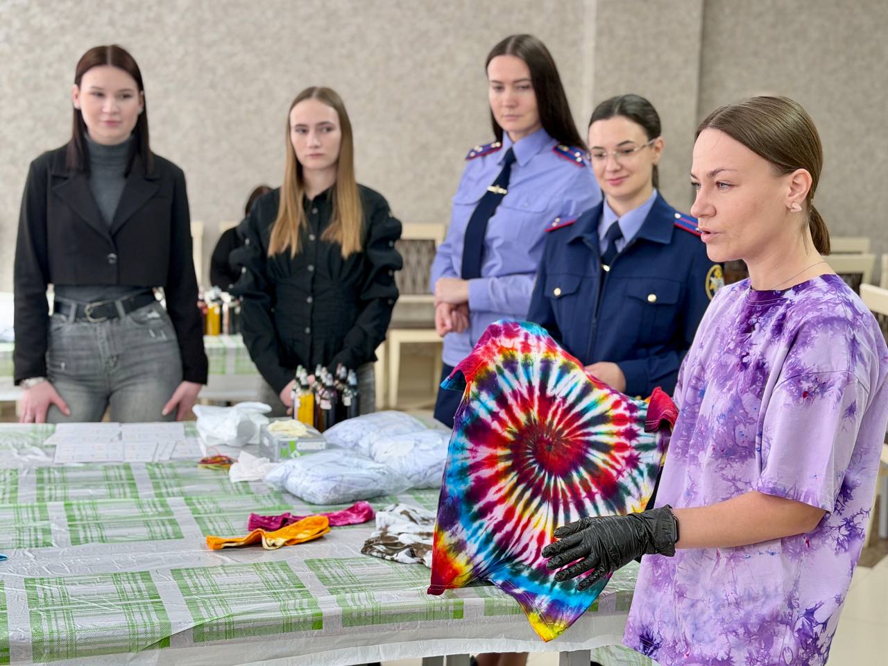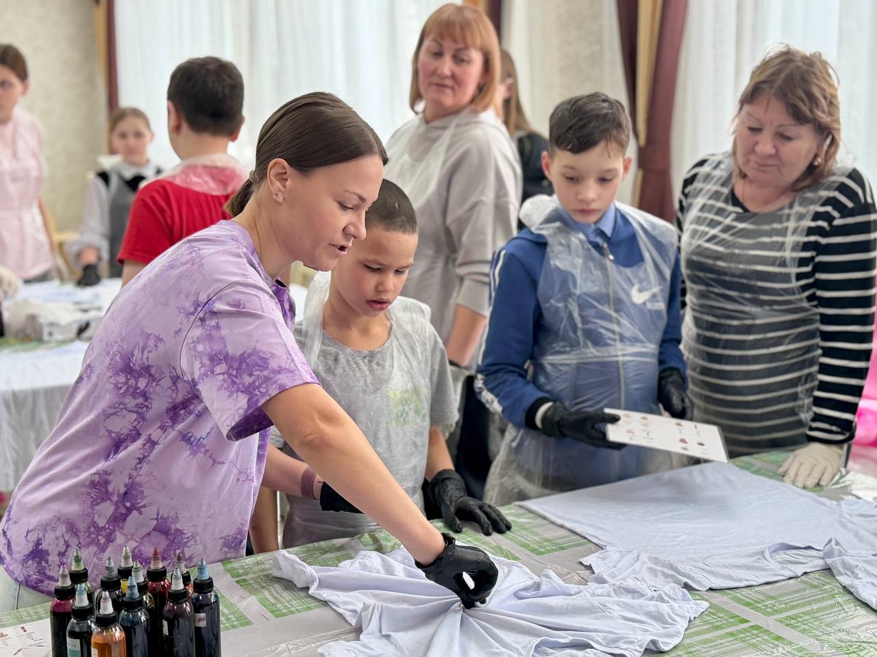 Екатерина рассказала ребятам о своем хобби и познакомила с популярной техникой окрашивания ткани «тай-дай». Она отметила, что такое занятие способствует развитию воображения, эстетического вкуса и умения выражать собственные чувства и эмоции через творчество. Под руководством наставников дети раскрасили белые футболки яркими красками, сделав их совершенно уникальными.