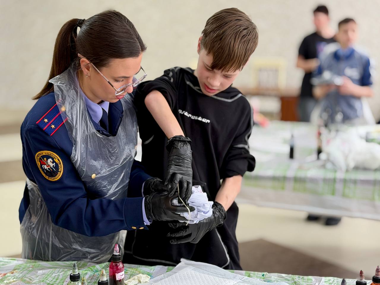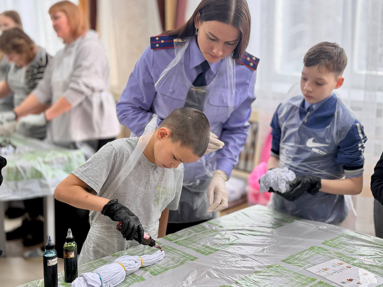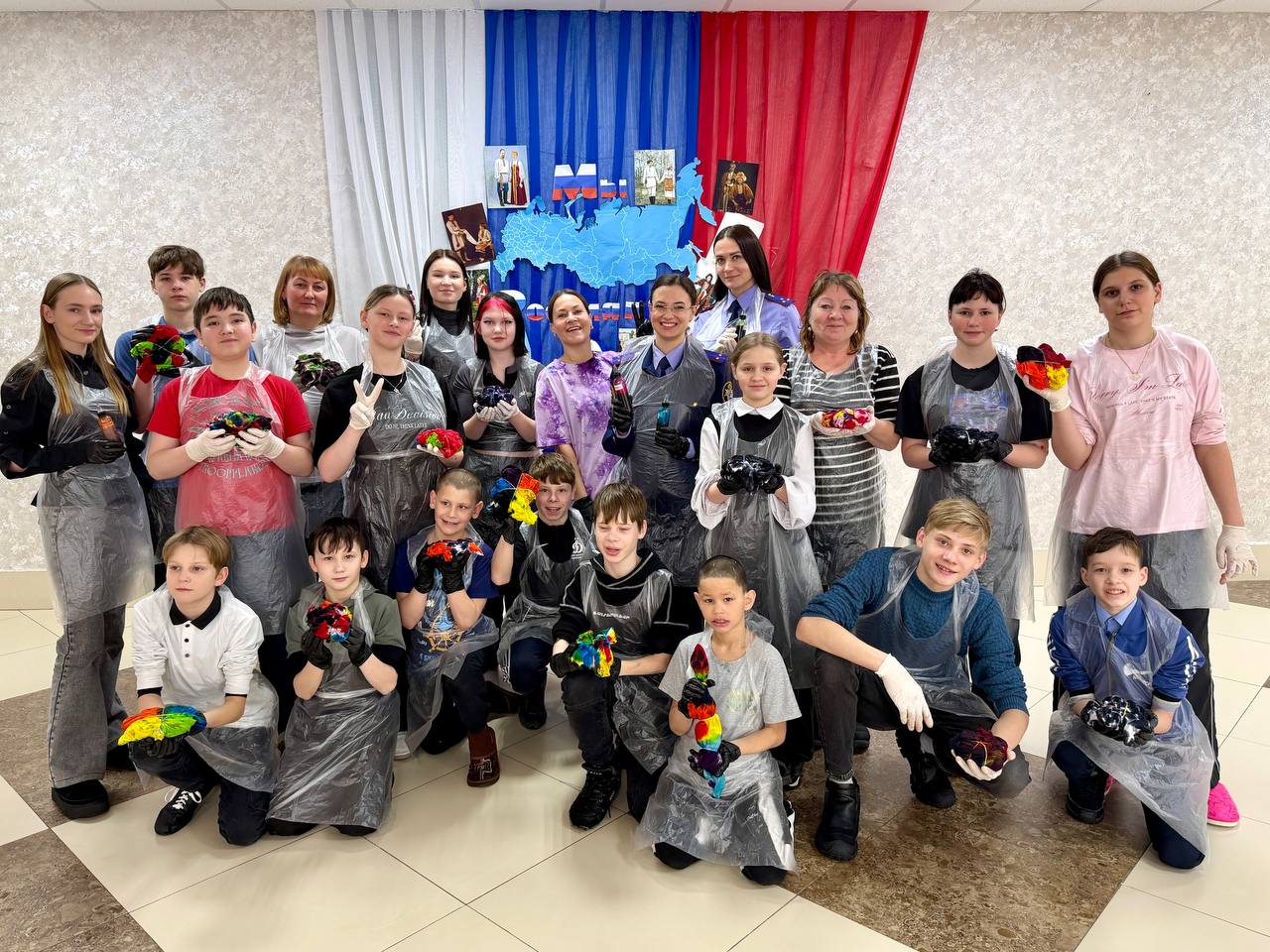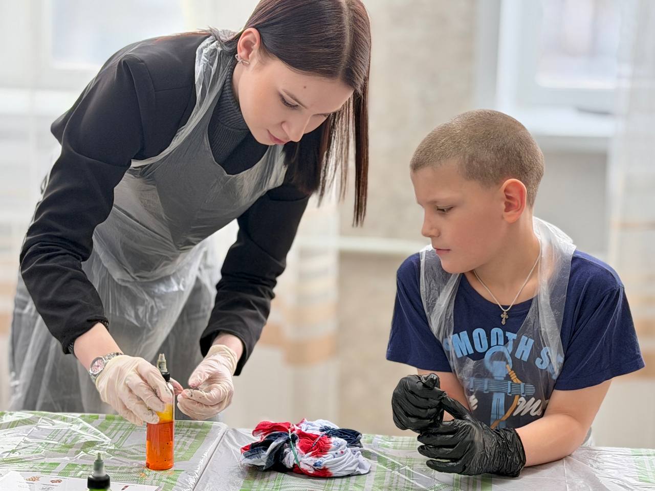 Екатерина рассказала ребятам о своем хобби и познакомила с популярной техникой окрашивания ткани «тай-дай». Она отметила, что такое занятие способствует развитию воображения, эстетического вкуса и умения выражать собственные чувства и эмоции через творчество. Под руководством наставников дети раскрасили белые футболки яркими красками, сделав их совершенно уникальными.