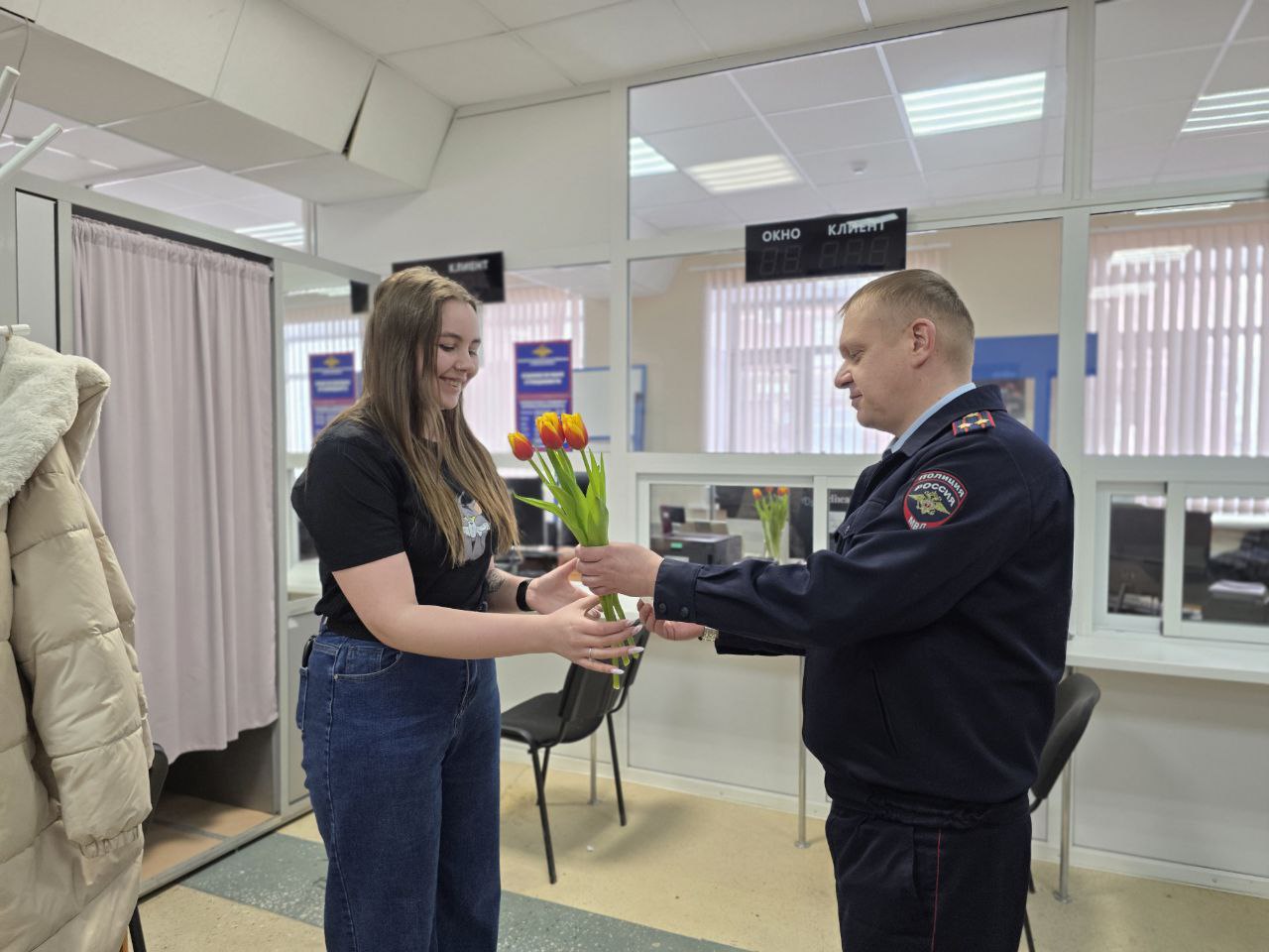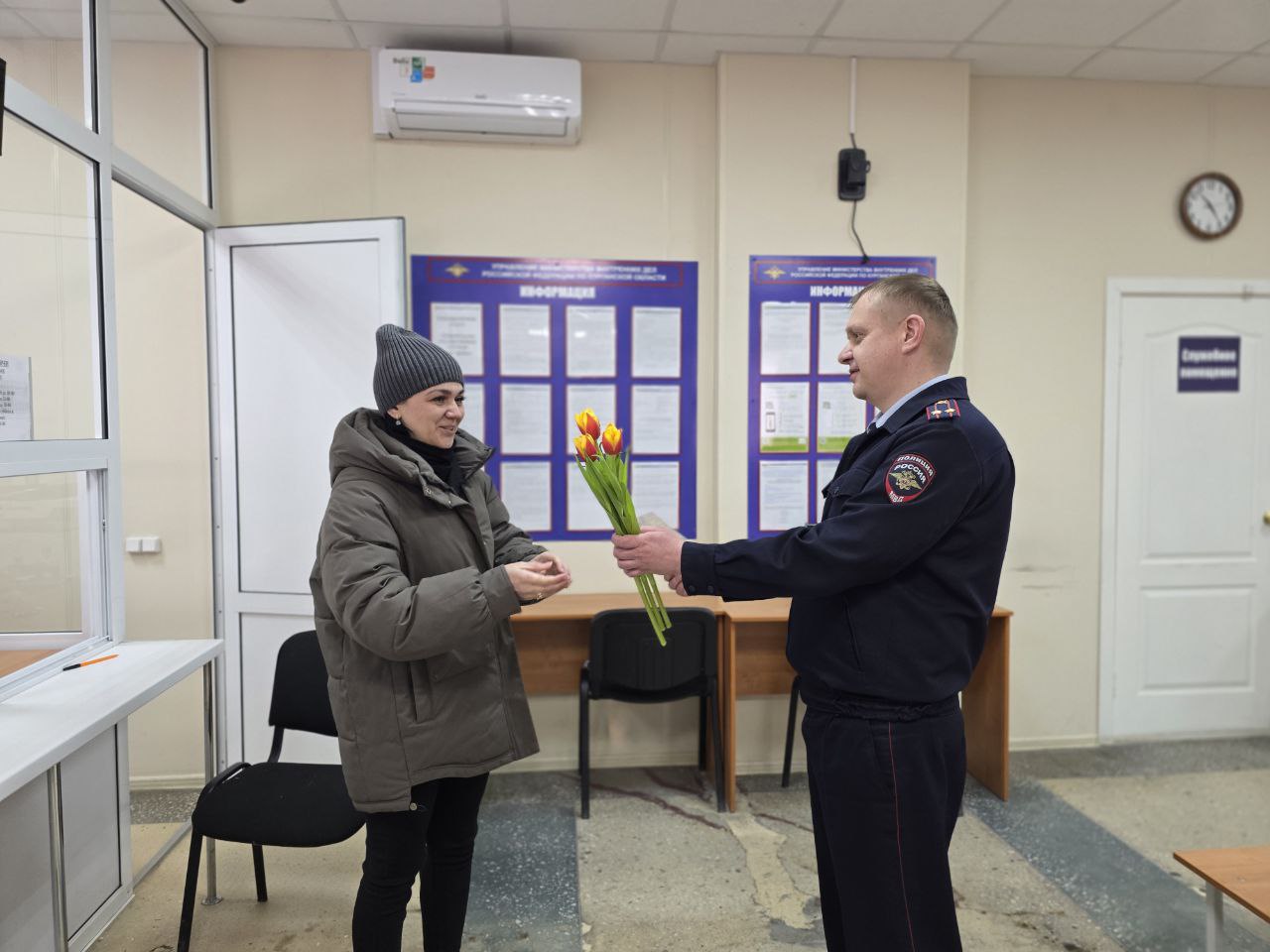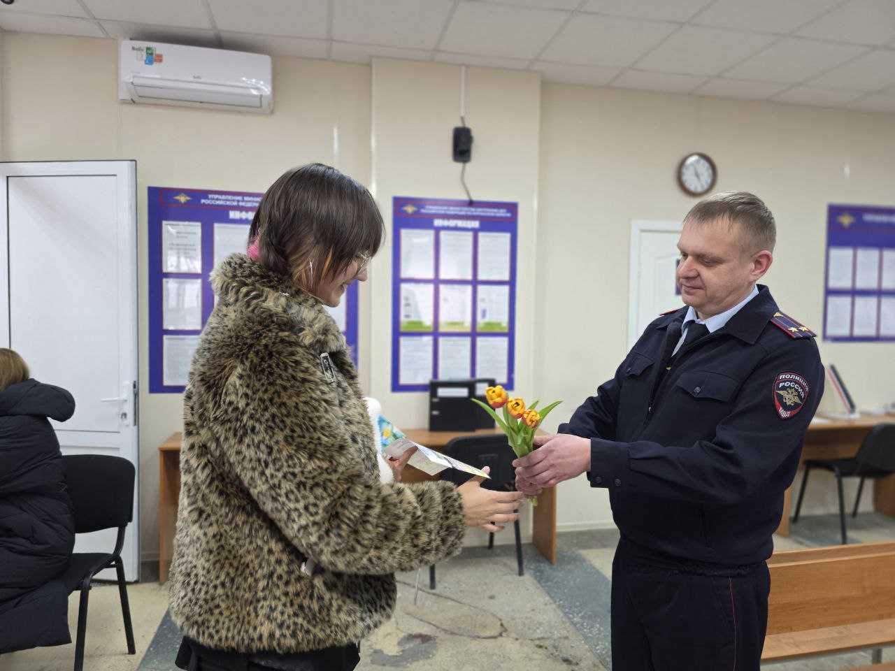 Накануне Международного женского дня сотрудники Управления МВД России по Курганской области провели праздничную акцию для посетительниц подразделений ведомства. Полицейские поздравили жительниц региона, которые обратились за получением государственных услуг, с наступающим праздником весны.