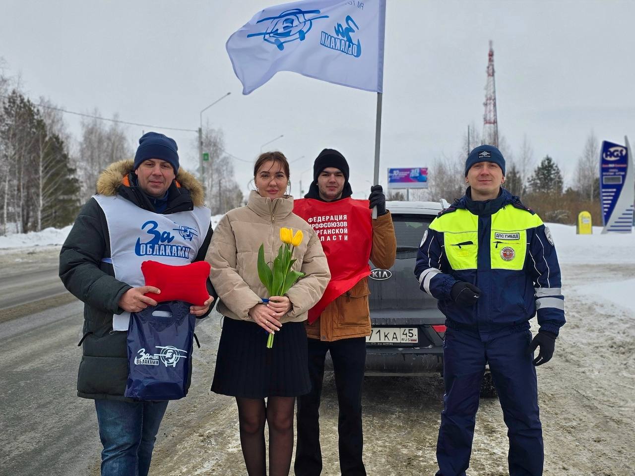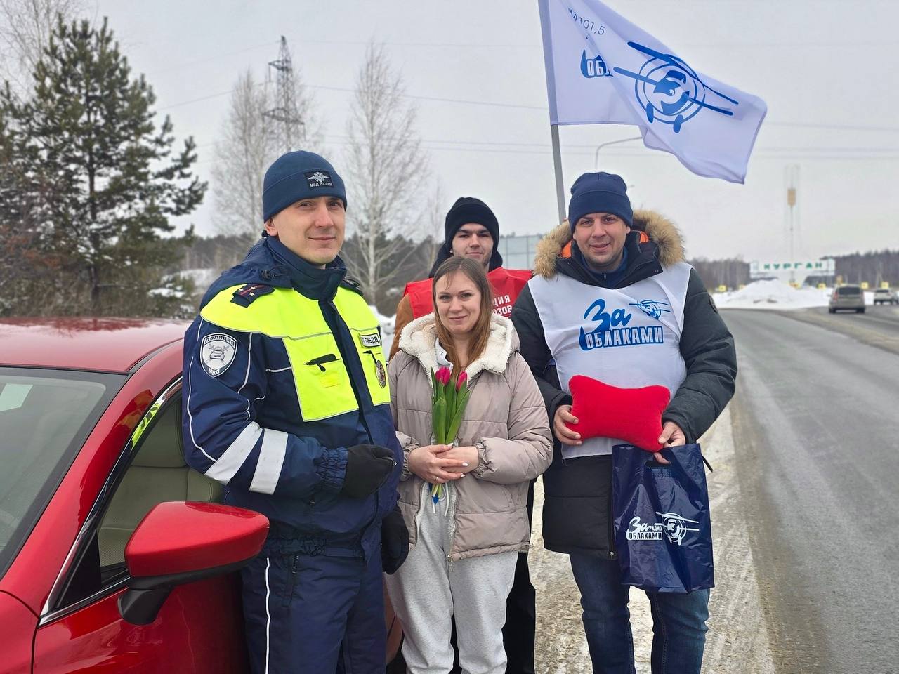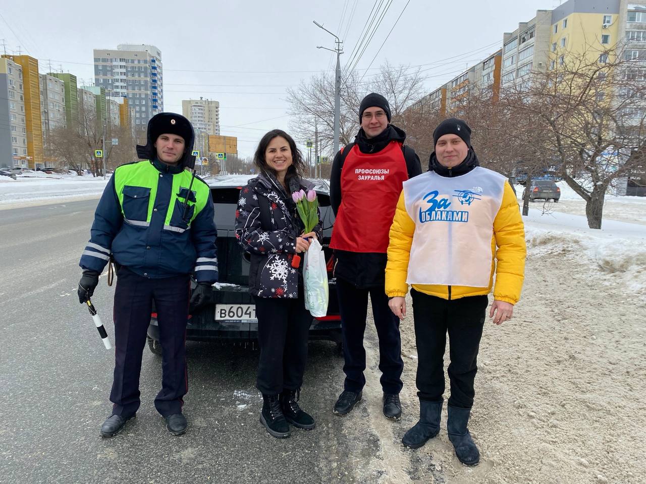 Автоинспекторы поздравляли женщин совместно с представителями «Радио за облаками» и активистами Федерации профсоюзов, которые дарили дамам приятные подарки.