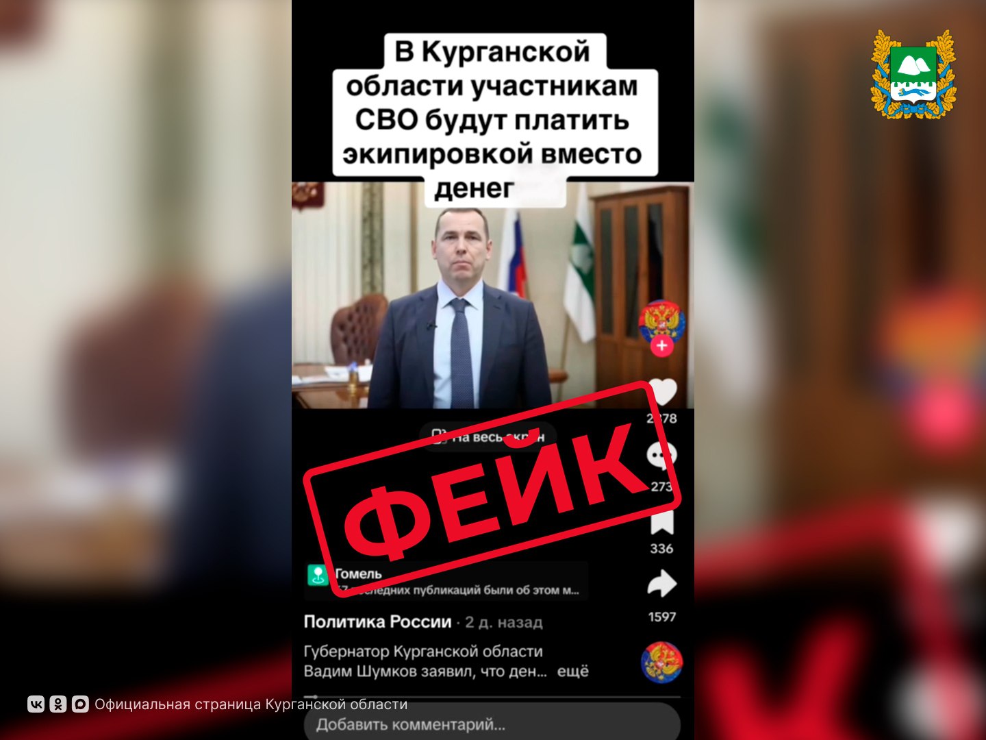 В соцсетях распространяется видео, на котором губернатор Курганской области Вадим Шумков сообщает о замене выплат бойцам СВО на экипировку. Это - фейк, сгенерированный ИИ, предупредили в правительстве.