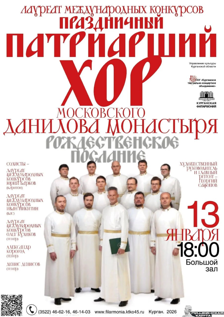 А завтра, 13 января, прозвучат церковные песнопения в исполнении Праздничного мужского хора московского Свято-Данилова монастыря. Концерт пройдет на сцене Курганской филармонии. Начало в 18:00.