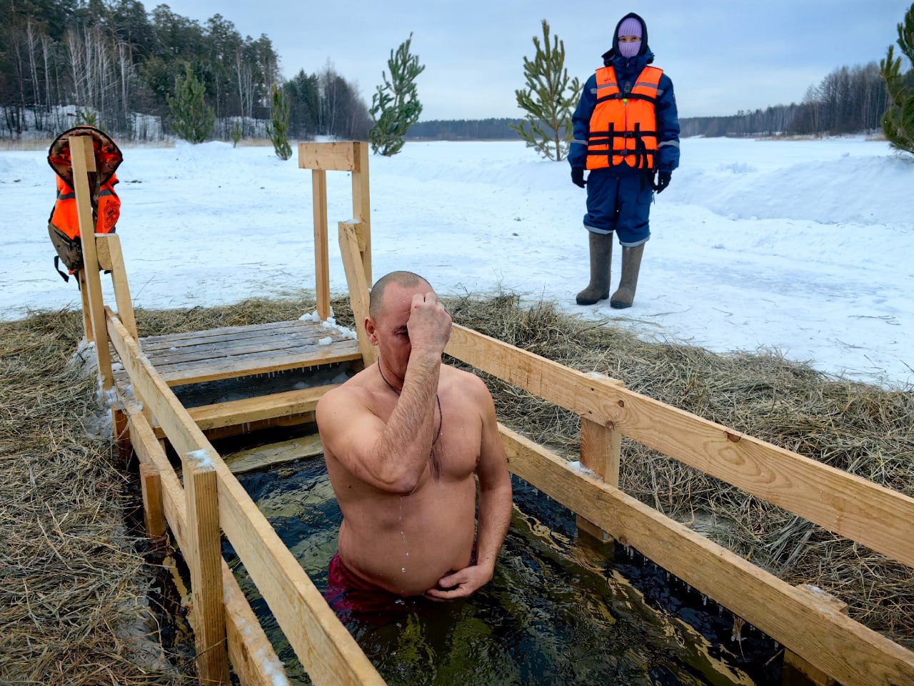 В Кургане сотрудники МЧС измеряют толщину льда в местах организации будущих купелей.