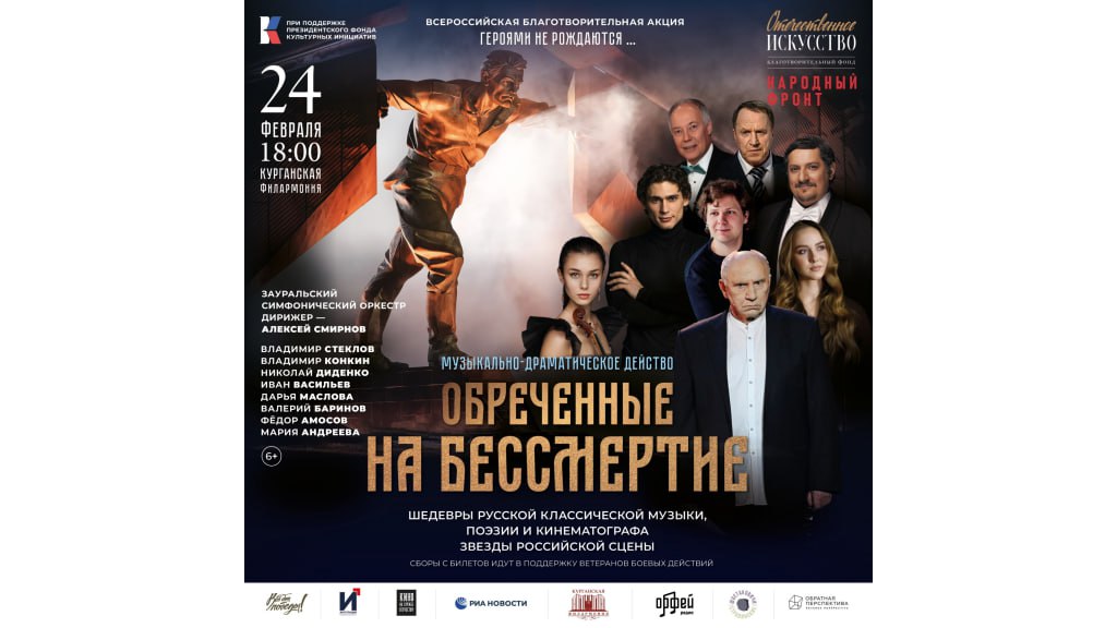 На сцене Курганской областной филармонии 24 февраля в 18:00 состоится благотворительный концерт-спектакль «Обреченные на бессмертие», посвященный защитникам Отечества. Мероприятие откроет всероссийскую акцию «Героями не рождаются…».
