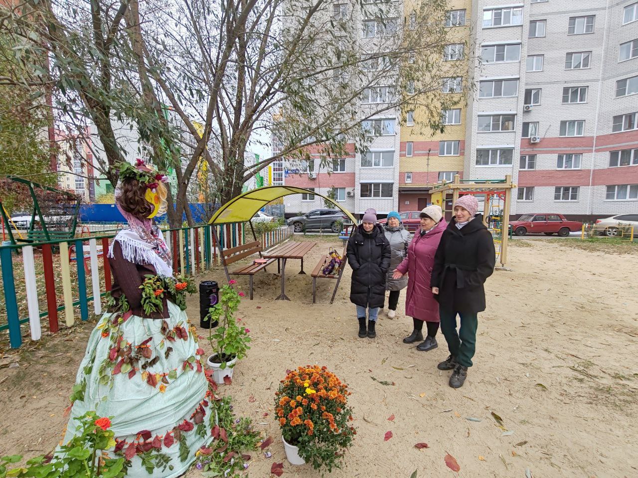 В ТОС «Заозёрный-7» жители свою ростовую куклу изготовили из прочного металлического каркаса, одели её в осенний наряд декорированный листьями.