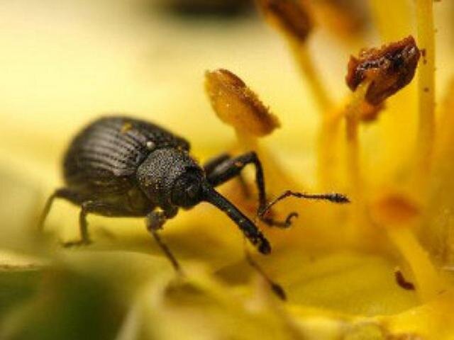Цветоед — это жук с удлинённым телом, окрашенным в серовато-коричневые тона. Личинки выглядят как беловатые червячки с яркими желтыми оттенками и тёмно-коричневой головой.