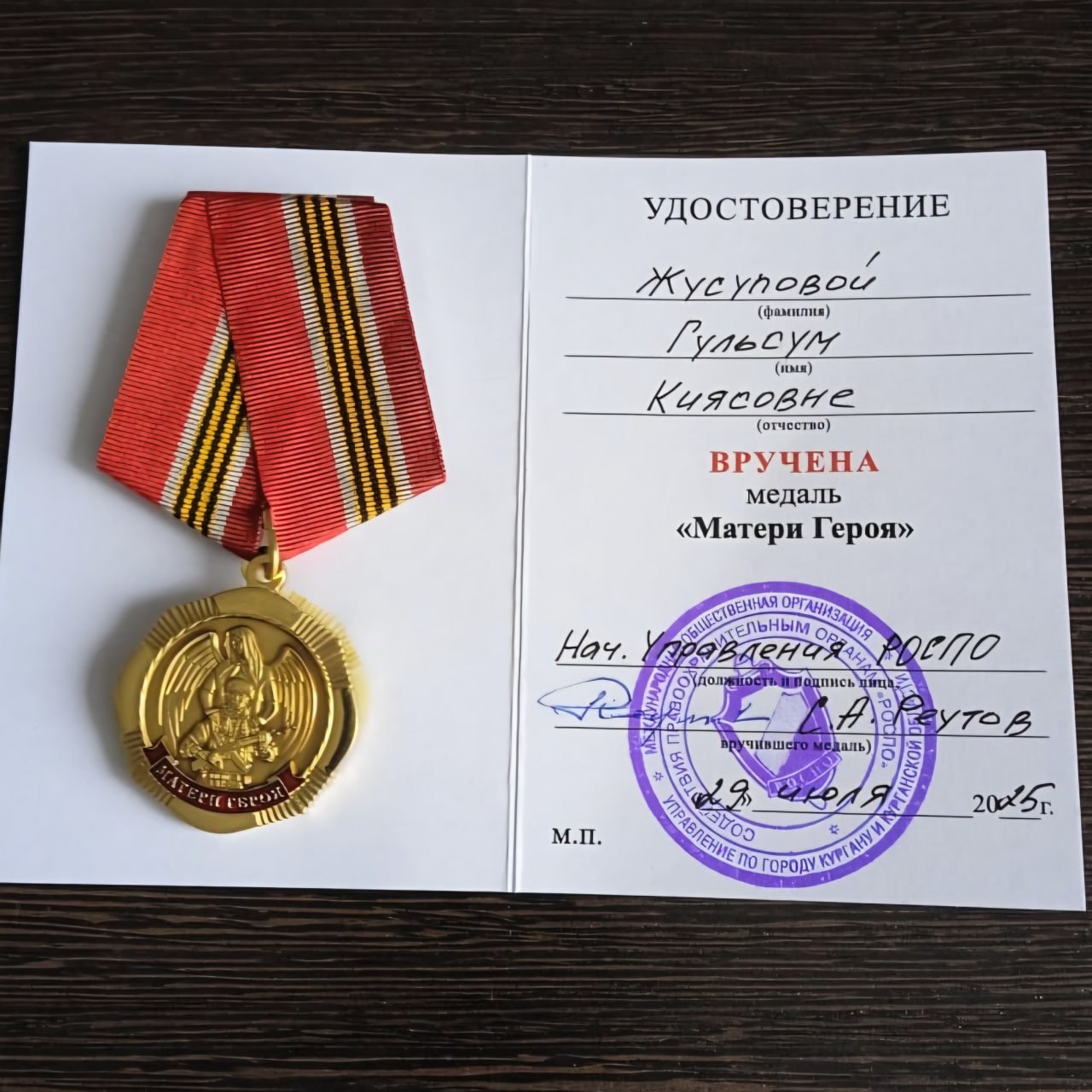 Жительница села Косолапово Целинного округа Гульсум Жусупова получила медаль «Матери Героя». Этой медалью награждаются матери, которые воспитали гражданина России, проявившего самоотверженность, мужество, отвагу, а также смелые решительные действия, совершенные при исполнении воинского долга по защите Отечества.
