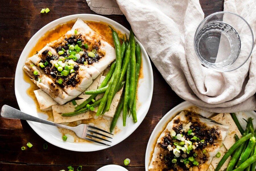 - Взять глубокую тарелку, годящуюся для пароварки. Выложить на дно куски тофу, создавая подушку для рыбы. Вокруг равномерно распределить стручки фасоли, слегка посолив их. На тофу положить филе рыбы и полить соусом из ферментированных бобов.