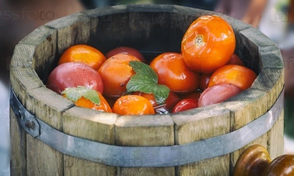 1. Начинать нужно с отборки свежих и плотных помидоров. Промыв их, укладывают в подходящую емкость. Оптимальным выбором станет дубовая бочка, но вполне сойдет любая другая посуда.