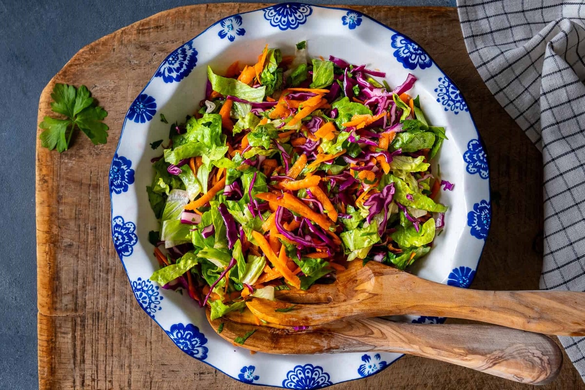 Далее натрите на крупной терке несколько морковок и смешайте их с капустой, мятья смесь руками для выделения сока. Добавьте нарезанные листья салата – это придаст салату легкость и свежесть. Не забудьте и про зелень: мелко нарезанная петрушка или кинза усилят аромат.