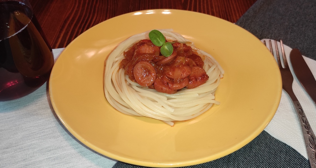 В центре сковороды создается свободное место, куда выкладывается томатная паста, которую обжаривают пару минут. После этого добавляют немного воды – так сосиски окажутся в густом и ароматном соусе. В этот момент в соус следует добавить смесь для брускетты, велев добавить щепотку соли, перца и немного сахара. Не забудьте о горошинах душистого перца, которые привнесут дополнительный вкус.