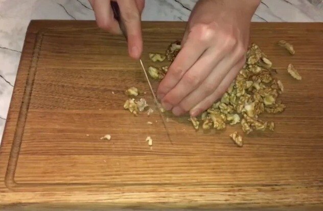 Когда все ингредиенты будут готовы, орехи можно нарезать ножом или взбить в блендере. Сыр натирается на средней терке. Важно нарезать отваренные овощи и курицу на аккуратные кубики, чтобы салат выглядел максимально привлекательно.
