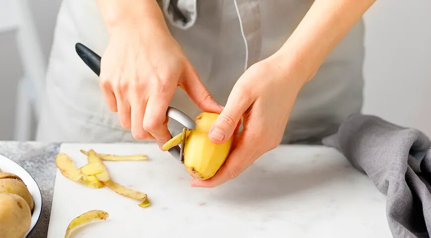 Для очистки подойдут либо короткий нож, либо овощечистка. Последний вариант более безопасен. Очистку стоит делать тонким слоем, чтобы не потерять полезные вещества, которые находятся близко к кожуре. Для молодого картофеля идеально подойдут металлические мочалки или крупная соль. После очистки картошки её необходимо сразу же поместить в кастрюлю с холодной водой, чтобы предотвратить потемнение.