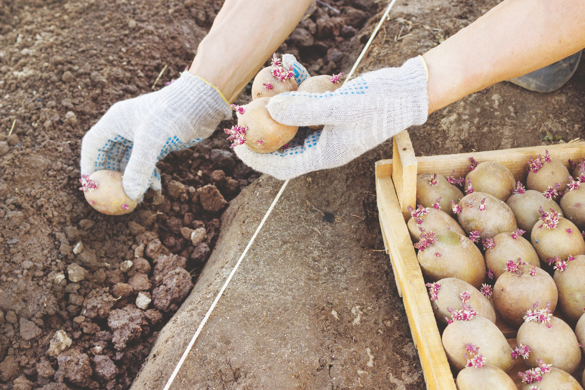 Во время высадки картофеля рекомендуется добавлять удобрения: как органические, так и минералы. Можно использовать шелуху от лука, чеснока или золу, чтобы обеспечить дополнительное питание и антибактериальные свойства для земли.
