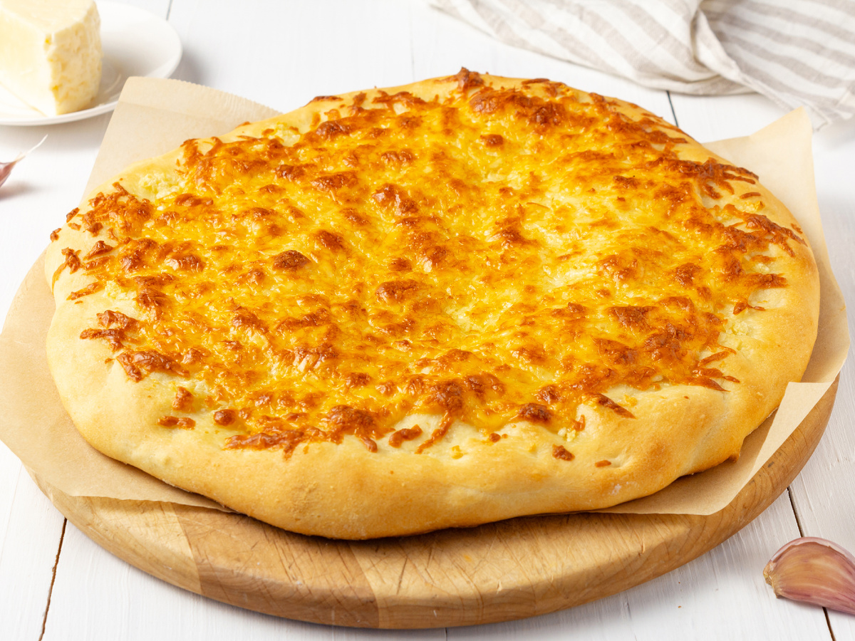 После часа выдержки тесто выкладывается на противень, предварительно покрытый пергаментом. Оно аккуратно растягивается руками до толщины 1-1,5 см. Вся поверхность смазывается чесночным маслом, затем равномерно распределяется натертый сыр. Выпекать лепешку следует в разогретой до 250°C духовке в течение 15 минут. Нельзя забывать контролировать процесс: после 10 минут стоит уже внимательно следить за ее состоянием — готовое изделие должно иметь румяные края, а сыр успешно расплавиться и подрумяниться.