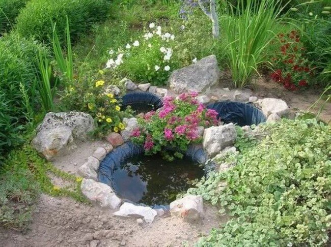 - Автомобильные шины: Обычные шины можно превратить в нестандартные пруды. Используйте креативный декор для дополнения и создайте иллюзию природного водоема.