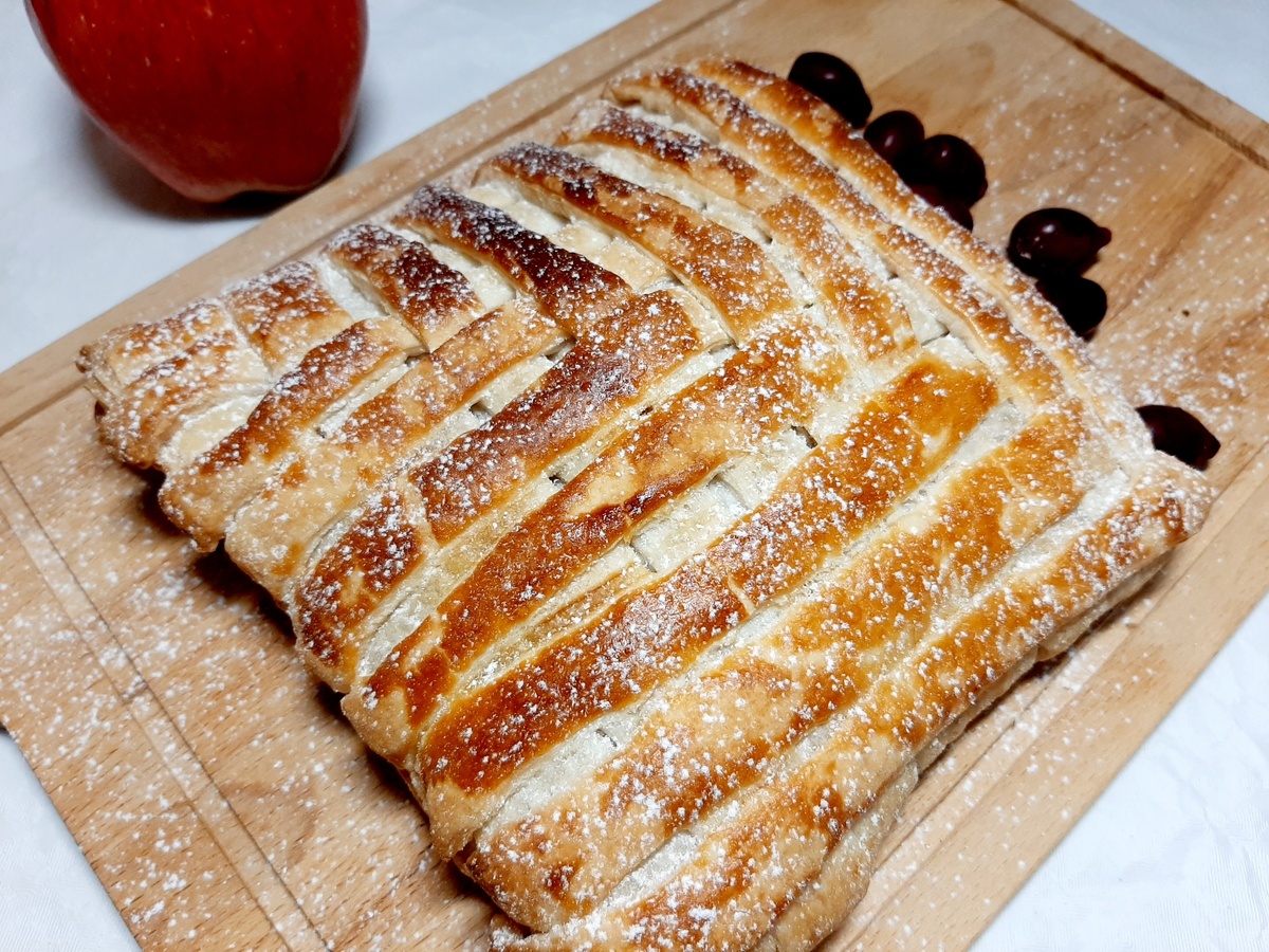 На одну сторону раскатанного теста выкладывается остывшая начинка из яблок. Затем накрывают начинку квадратом теста и защипывают края, используя полоски теста для формирования узора плетенки. Процесс повторяется до тех пор, пока не закончится тесто или начинка.