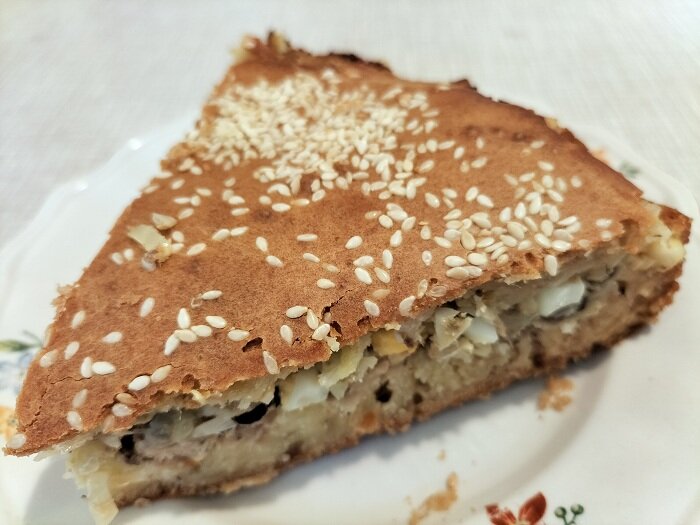 3. Формируем пирог. Заранее разогрейте духовку до 210-220 градусов. В смазанную форму вылейте 2/3 теста, равномерно распределите, затем добавьте начинку, и завершите оставшимся тестом. Для украшения можно посыпать кунжутом.
