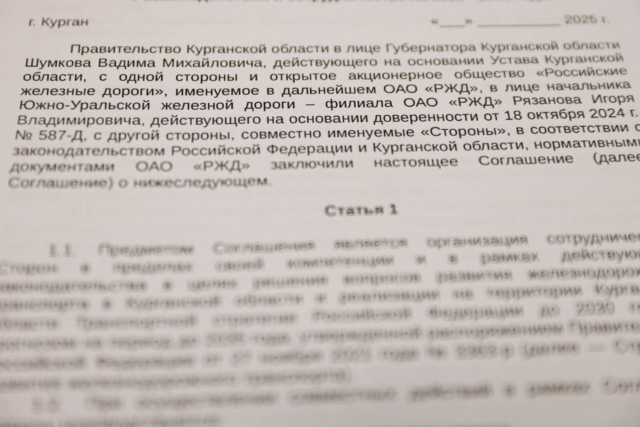 Губернатор Вадим Шумков и начальник ЮУЖД Игорь Рязанов подписали соглашение о сотрудничестве между правительством Курганской области и ОАО «РЖД» на 2026-2030 годы. Подписание состоялось сегодня, 22 октября, в ходе рабочей встречи в Кургане.