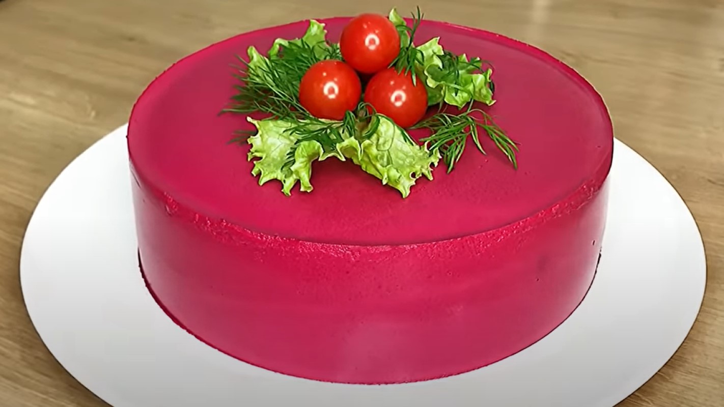 Если не нравится вкус желатина, добавьте к свекле вареные яйца и взбейте до густоты, советует автор Дзен-канала «Ланч блог». Потом раздвиньте форму на пару сантиметров и залейте салат глазурью из кондитерского мешка.