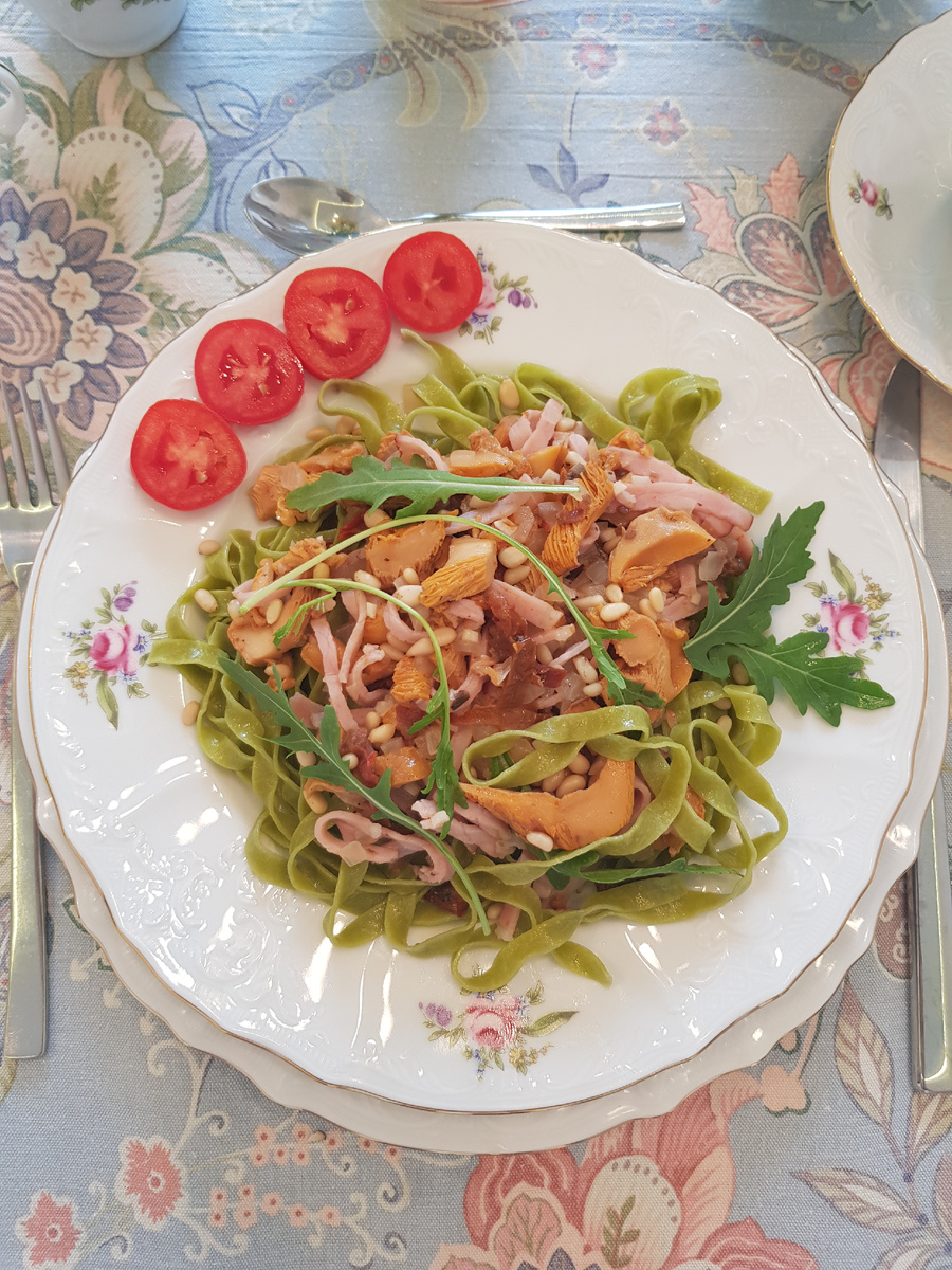 8. Чтобы создать красивую подачу блюда, выложите пасту на тарелку, сверху разместите грибную смесь, добавьте руколу и кедровые орехи. Не забудьте украсить свежими, нарезанными помидорами.