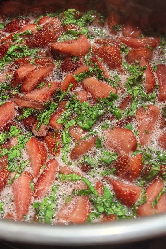 После того как клубника пропиталась, поставьте миску на медленный огонь. Доведите до кипения и варите 5 минут, убирая пену. Затем добавьте нарезанные листья мяты и базилика. Продолжайте варить еще 5 минут после повторного закипания.