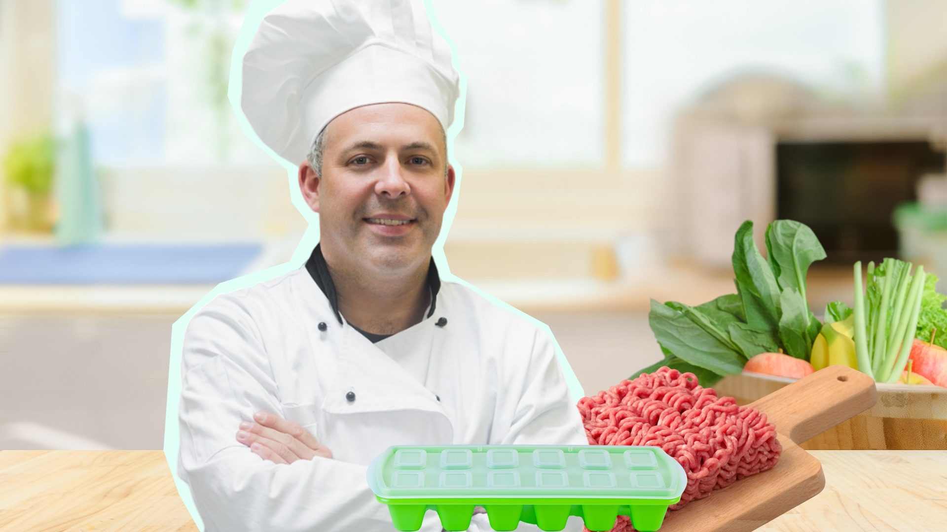 В каждую ячейку чистой формы для льда на половину уложите фарш. Сверху накройте кусочком сыра и заполните мясом до края емкости. Получившиеся кубики уберите в морозилку на два часа.