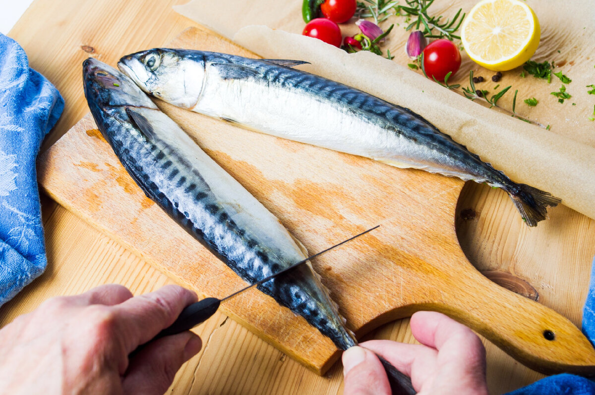 Подготовка рыбы: Удалить голову, хвост и внутренности скумбрии. Вымойте рыбу под холодной водой и обсушите бумажными полотенцами.