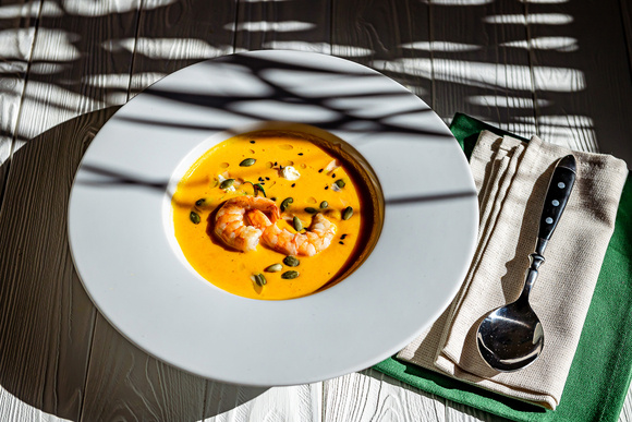 Этот рецепт принадлежит Павлу Хорсову, шеф-повару ресторана "Рыбная Мануфактура №1". С его помощью вы сможете создать нежный и насыщенный суп, где тыква и креветки идеально дополняют друг друга.