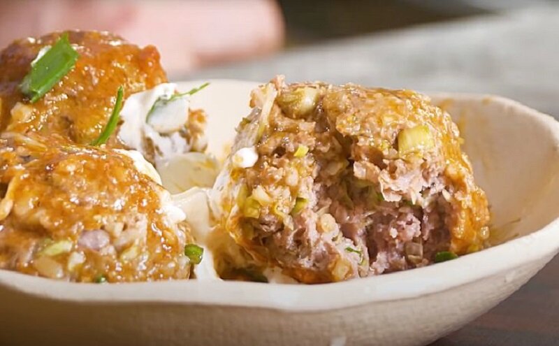 Когда овощи готовы, сформируйте большие фрикадельки и уложите их в форму для запекания, посыпьте острым перцем, сельдереем и грибами. Затем залейте томатным соусом и немного посолите. Накройте форму фольгой и запекайте в заранее разогретой до 180°C духовке в течение 30-40 минут.
