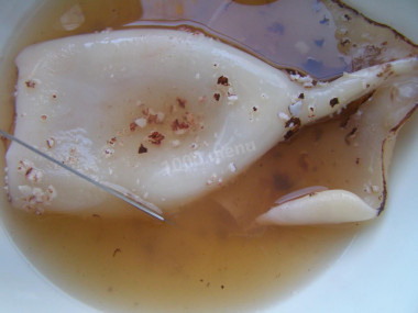 Первый шаг — подготовка кальмара. Разморозьте тушку и эффективно очистите её от пленки, используя кипяток для удобства. Далее удалите хвост, внутренности и хитиновую пластину.