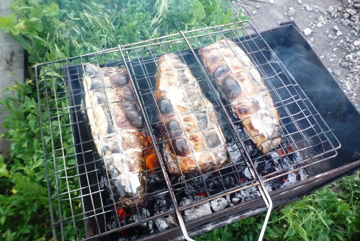 Когда рыба промариновалась, можно приступить к её жарке. Разместите скумбрию на решетке и готовьте на углях, следя, чтобы она не подгорела — жирная рыба может создавать языки пламени. Для гарнира отлично подойдут молодые кабачки, которые следует нарезать пополам и уложить на решетку. Их не стоит солить заранее, чтобы они не пустили сок. Как только кабачки станут мягкими, посыпьте их солью, перцем и добавьте немного масла.