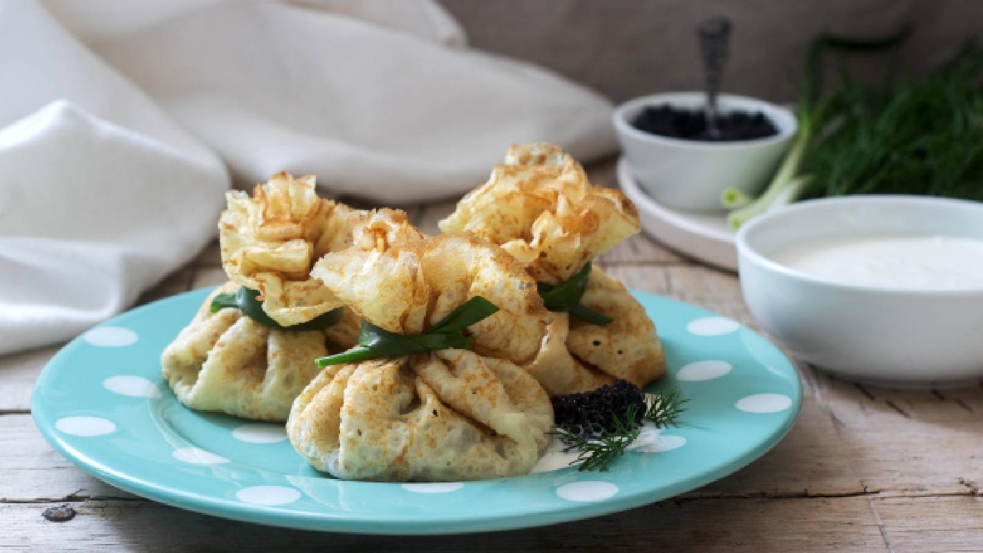 Венгерские блинчики с курицей не зря носят такое интересное название. Все дело в необычной подаче. Края блюда перевязывают перьями зеленого лука, отчего они напоминают тугой кошель, набитый монетами.