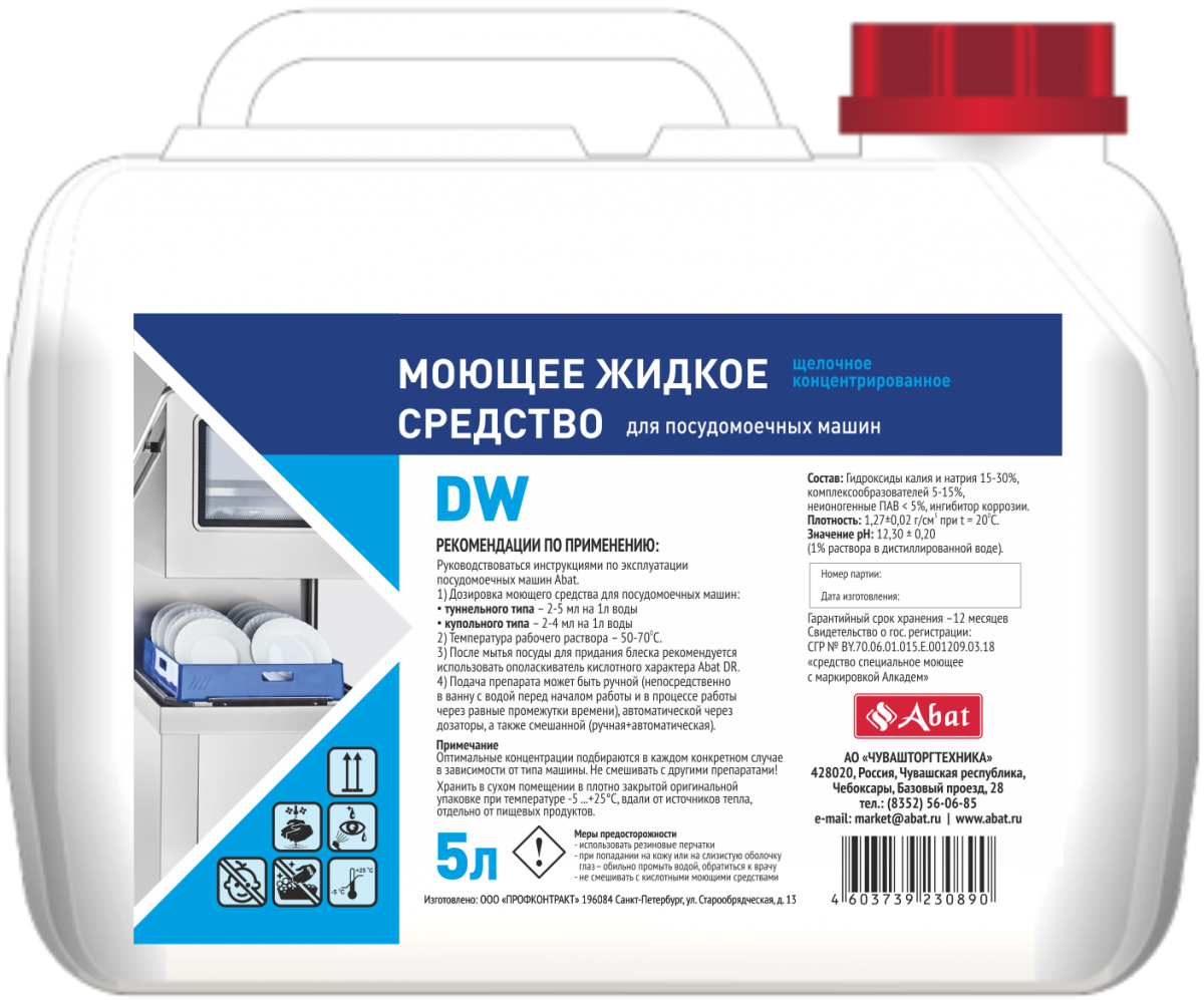 Abat DW - универсальный боец в мире посудомоечных средств. Это концентрированное щелочное средство обеспечивает отменную очистку жировых загрязнений и остатков пищи на различных поверхностях. Его можно использовать как с туннельными, так и купольными посудомойками, при этом оптимальная температура для его работы составляет от 50 до 70°C.