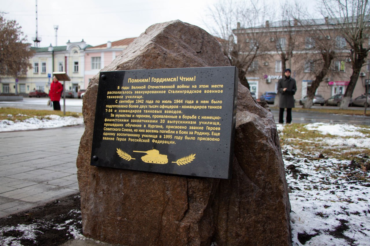 Закладной камень установлен недалеко от Курганской областной филармонии. Отсюда сразу же после окончания училища уходили на фронт еще совсем молодые ребята. Они отдали свои жизни за свою Родину, за нас с вами. И мы не должны забывать об их подвиге, как не должны забывать о подвигах бойцов, которые сейчас сражаются на СВО.