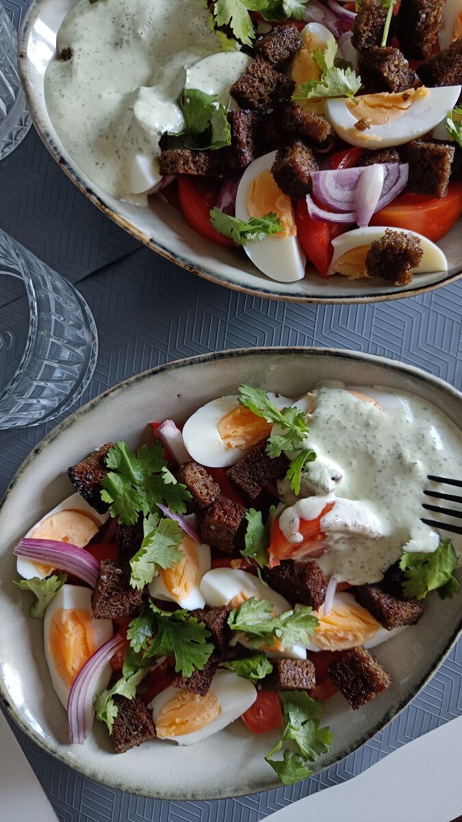 Приготовление не займёт много времени. Хлеб нарезается кубиками и обжаривается на сковороде, после чего помещается в миску. Далее добавляется нарезанное яйцо, помидоры и миллиметровые ломтики лука. Затем следует подготовить соус, соединяя в блендере сметану, оливковое масло и кинзу. Всё это необходимо хорошо смешать, чтобы получить однородную массу, и добавить в салат.