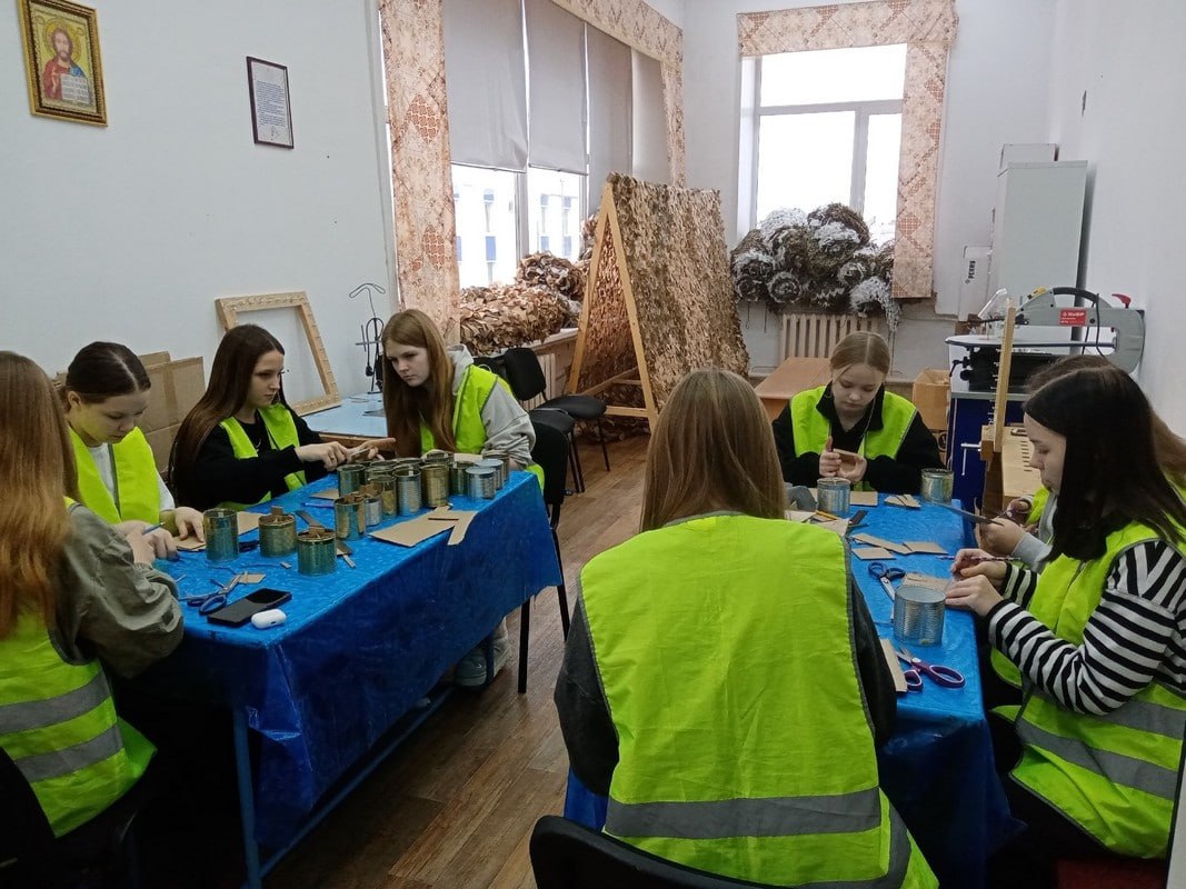 Ученики курганской школы изготавливают окопные свечи и маскировочные сети.