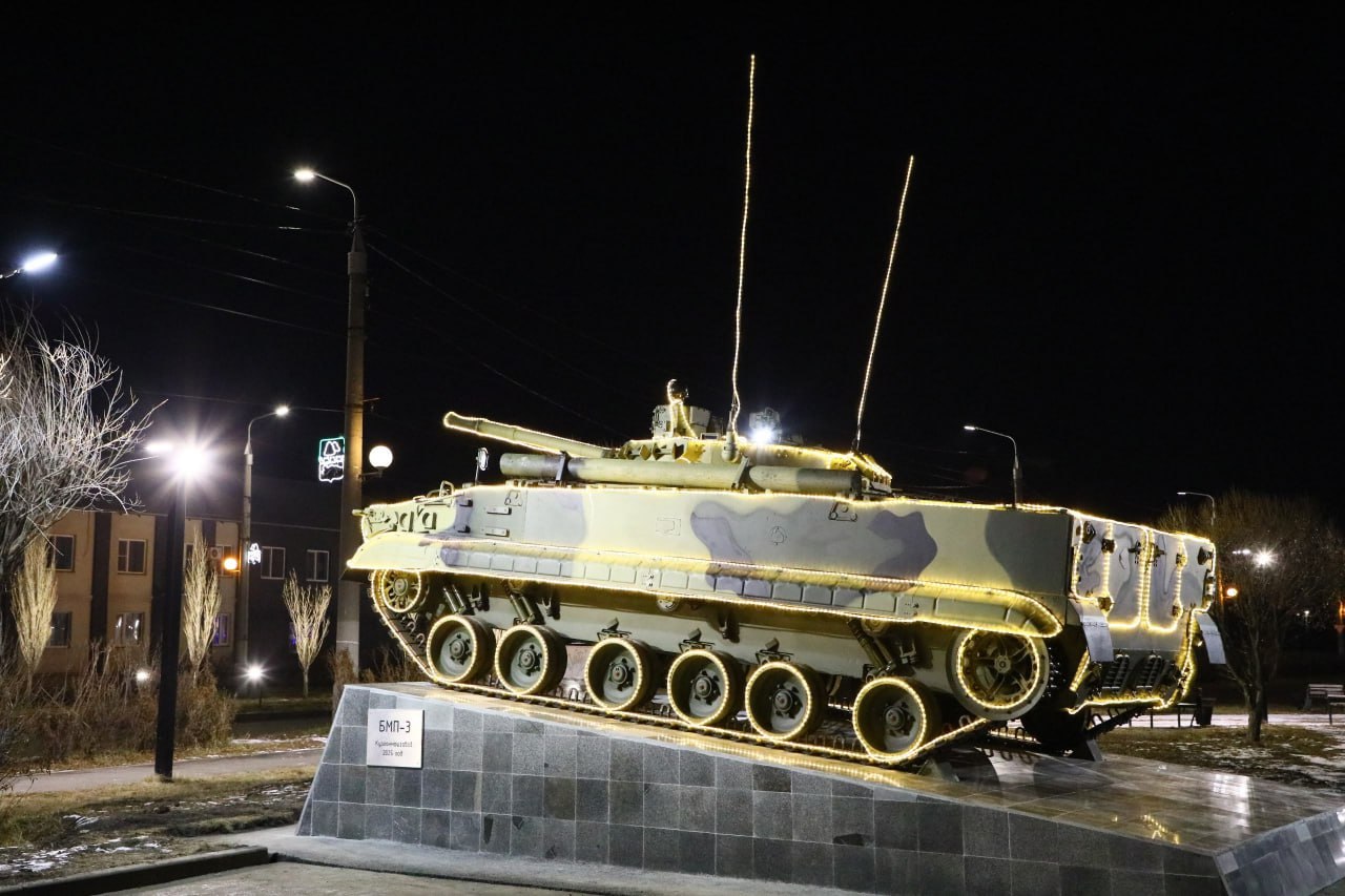 В пресс-службе губернатора подчеркнули, что инициатива принадлежит главе региона Вадиму Шумкову. Администрация города по его распоряжению установила постамент, Курганмашзавод — БМП-3 с оригинальной подсветкой.