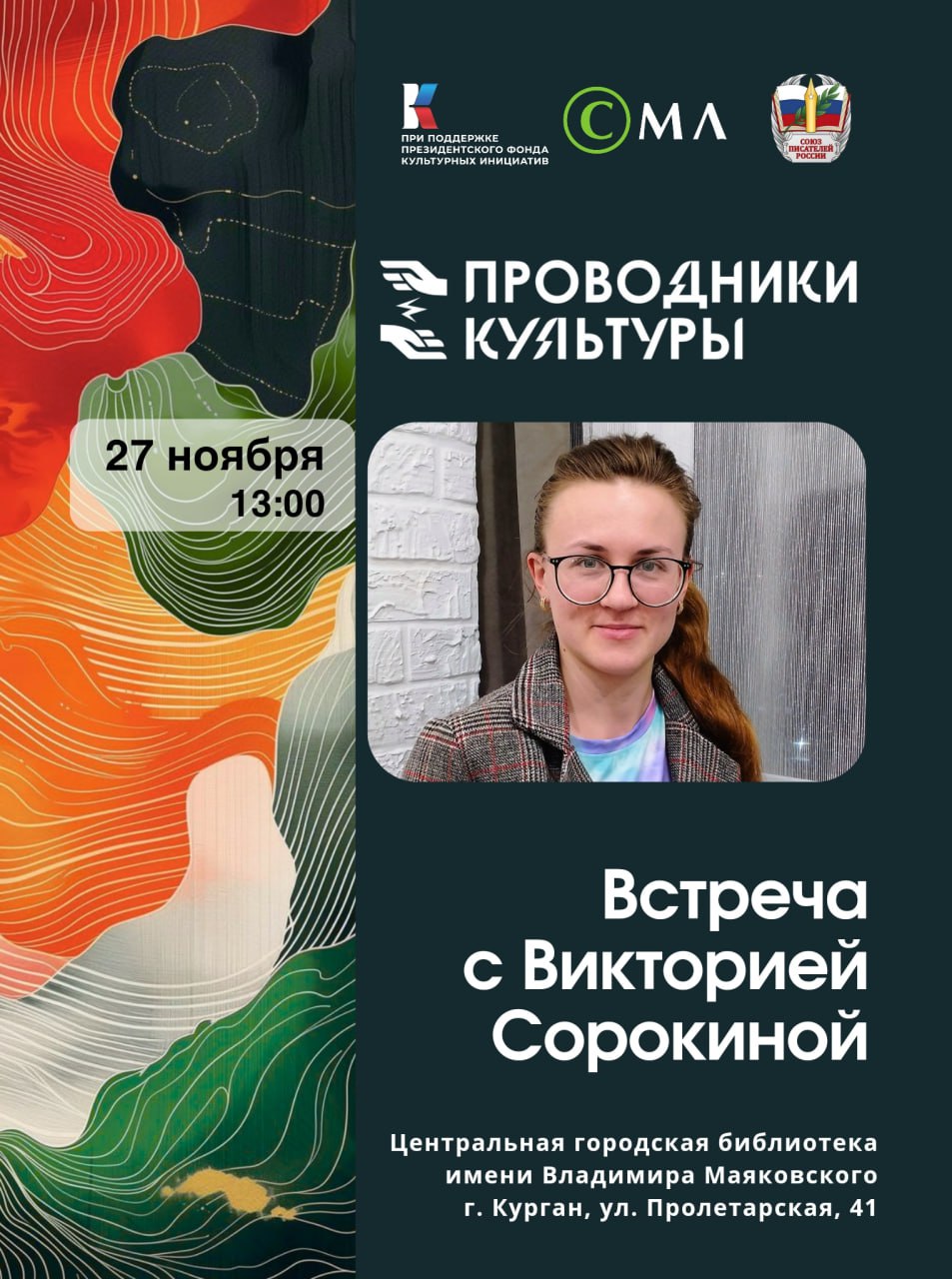 Маяковка приглашает курганцев 27 ноября на литературную встречу с победителем конкурса «Проводники культуры». Виктория Сорокина родилась в селе Каминском Куртамышского муниципального округа, окончила педагогический колледж и филологический факультет КГУ. Девушка является лауреатом многих литературных конкурсов.