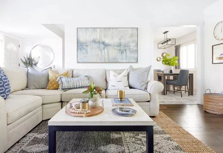 - Рассмотрите альтернативные варианты, когда диван не переносится в центр, а отодвигается от стены — это также может создать более открытое и свободное пространство.