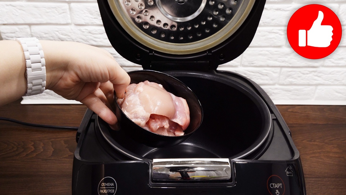 1. В чашу мультиварки помещаются куриное филе и специи. Затем нужно залить их холодной водой.