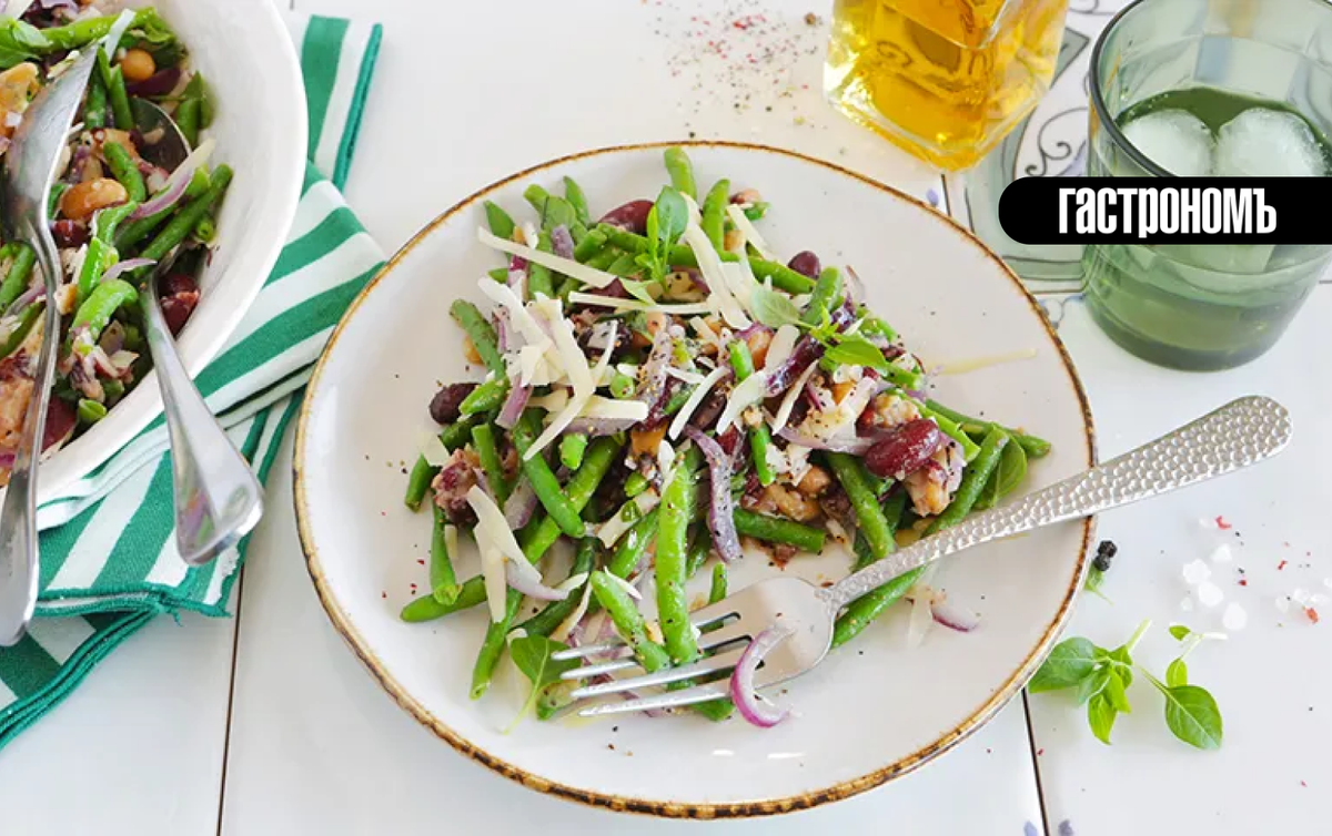 Откиньте белую и красную фасоль на дуршлаг, по желанию промойте их под холодной водой и дайте жидкости полностью стечь. Переложите в глубокую миску и слегка раздавите вилкой.Зеленую фасоль положите в кипящую подсоленную воду, затем доведите до кипения. Уберите с огня и оставьте мякать в воде на 3-4 минуты. После этого охладите в ледяной воде, откиньте на дуршлаг и обсушите.Лук нарежьте тонкими полукольцами, а чеснок измельчите. Обжарьте лук на растительном масле в течение 2 минут на сильном огне, периодически помешивая. Затем добавьте чеснок, перемешайте в течение 20 секунд и снимите с огня. Готовую массу соедините с белой и красной фасолью, пока масло ещё теплое. Вмешайте зеленую фасоль, добавьте соль и дайте настояться 10 минут.Натрите сыр на крупной терке. В завершение добавьте нарванные руками листья базилика, разложите по тарелкам. Посыпьте свежемолотым черным перцем и тертым сыром, подавайте к столу сразу же.