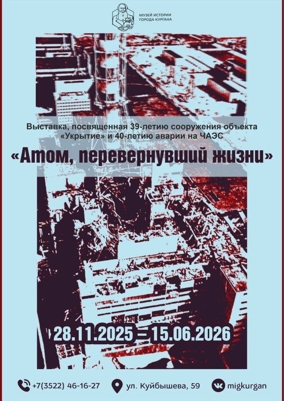 В Музее истории города Кургана 28 ноября в 14:00 откроется выставка «Атом, перевернувший жизни». Экспозиция посвящена 39-летию сооружения объекта «Укрытие» и предстоящему 40-летию аварии на Чернобыльской АЭС.