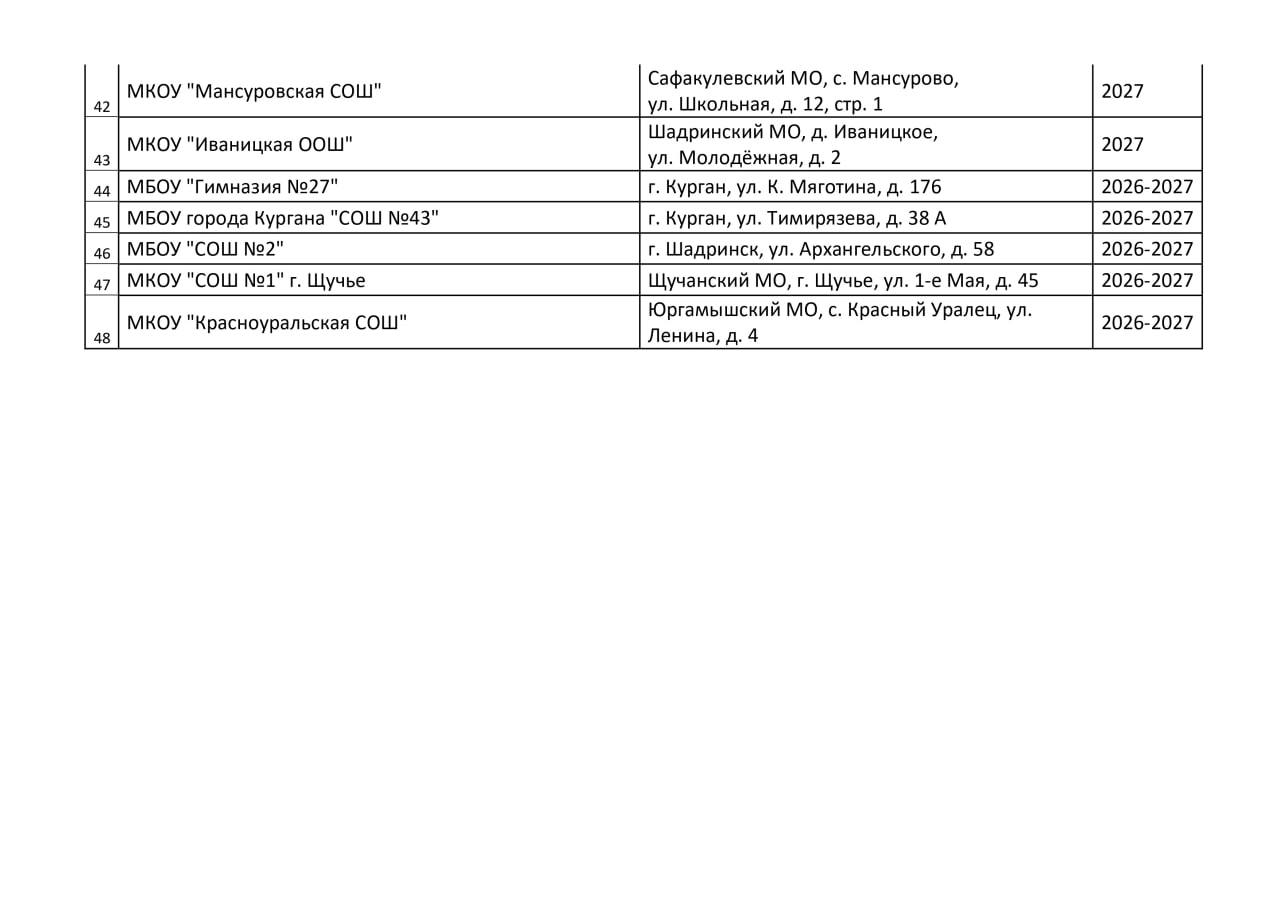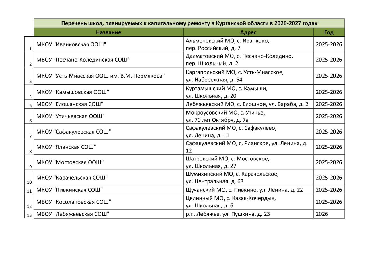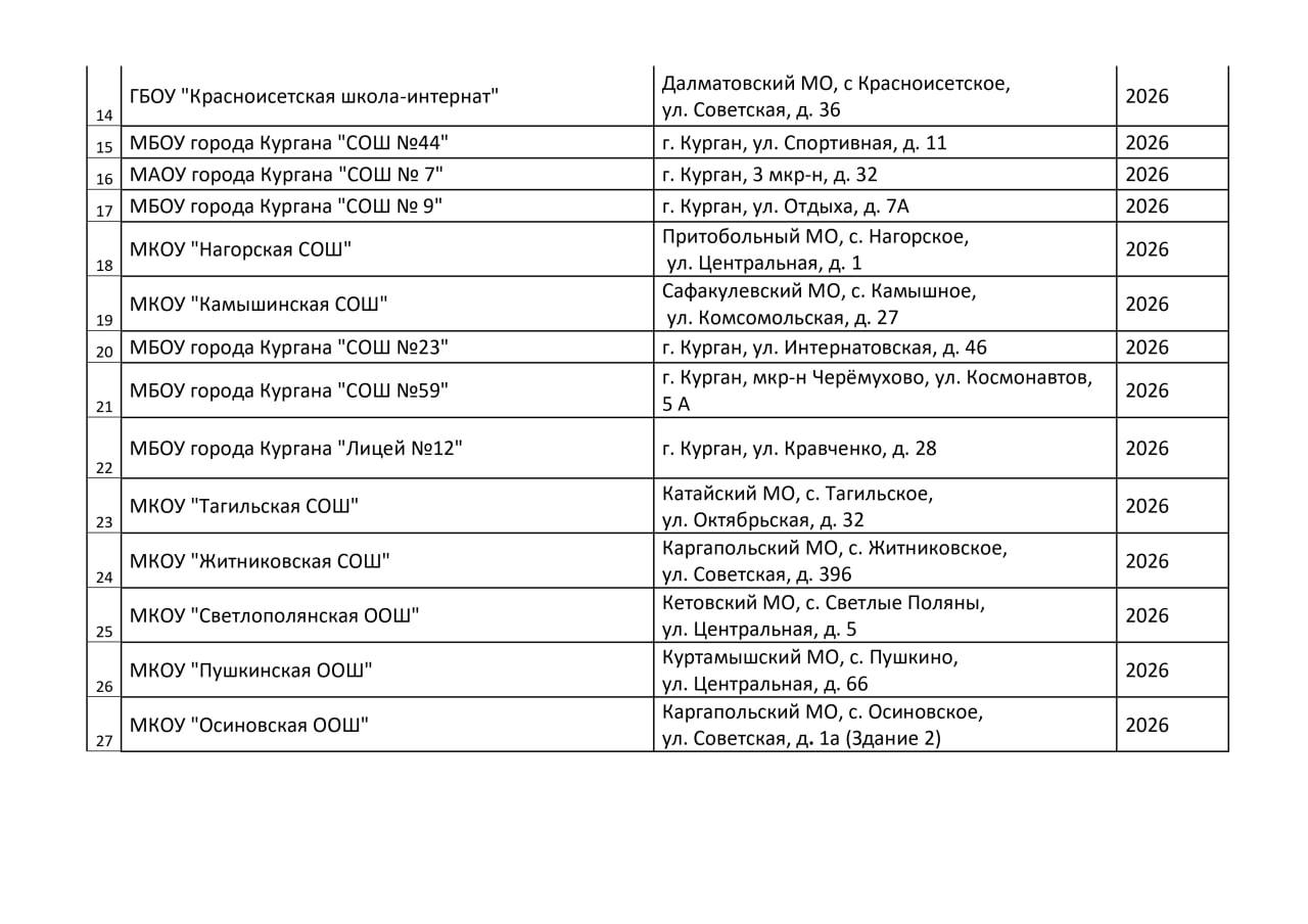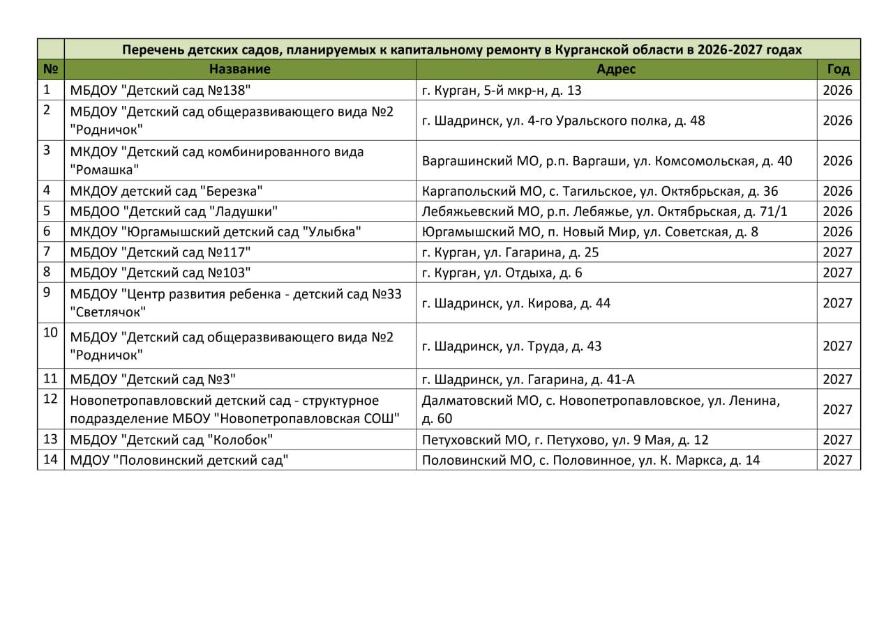 В перечень школ и детских садов, которые капитально отремонтируют в 2026-2027 годах в Курганской области, вошли образовательные организации городов Кургана и Шадринска, а также округов региона.