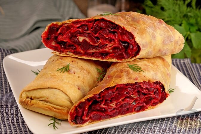 - Штрудель со свёклой — этот удивительный десерт с начинкой из обжаренной свёклы и лука несомненно станет изюминкой любого стола. Лёгкое тесто и яркие оттенки свёклы порадуют не только глаз, но и желудок!