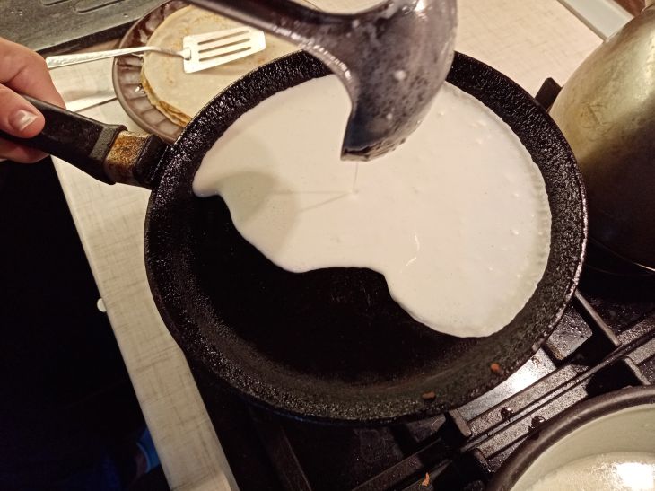 1. Перед тем, как приступить к выпечке, щедро насыпьте на сковородку соль и прокалите ее.