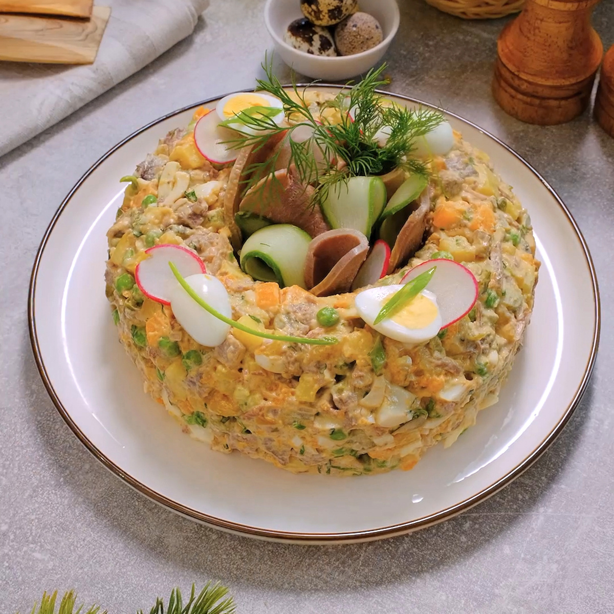 Собранный в форме круга салат может быть дополнен кусочками свежих овощей или зелени, а также небольшими креманками с майонезом, чтобы каждый мог добавить по вкусу. Этот оригинальный оливье точно станет звездой любого праздничного стола и подарит вашим близким настоящую кулинарную радость!