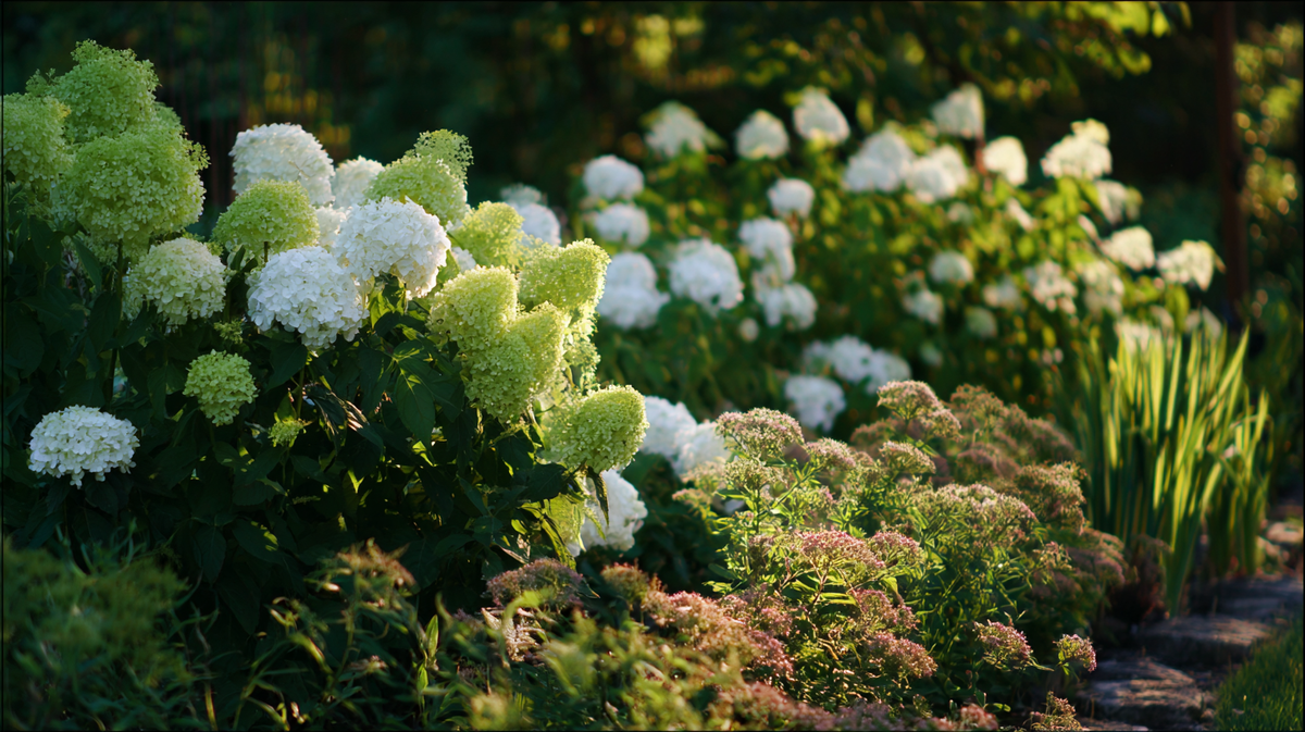 Красивый цветник начинается с выбора декоративных кустарников. Эти крупные растения не только задают общий ритм и высоту, но и создают необходимую структуру. Например, такой выбор как гортензия Лаймлайт или спирея Фробели станет отличной основой для цветника. Разумно избегать чрезмерной пёстроты: соседство ярких куста, как, например, красная гортензия и розовая спирея, может создать слишком шумный фон без глубины. Поэтому важно, чтобы выбранные кустарники дополняли друг друга по цвету и форме.